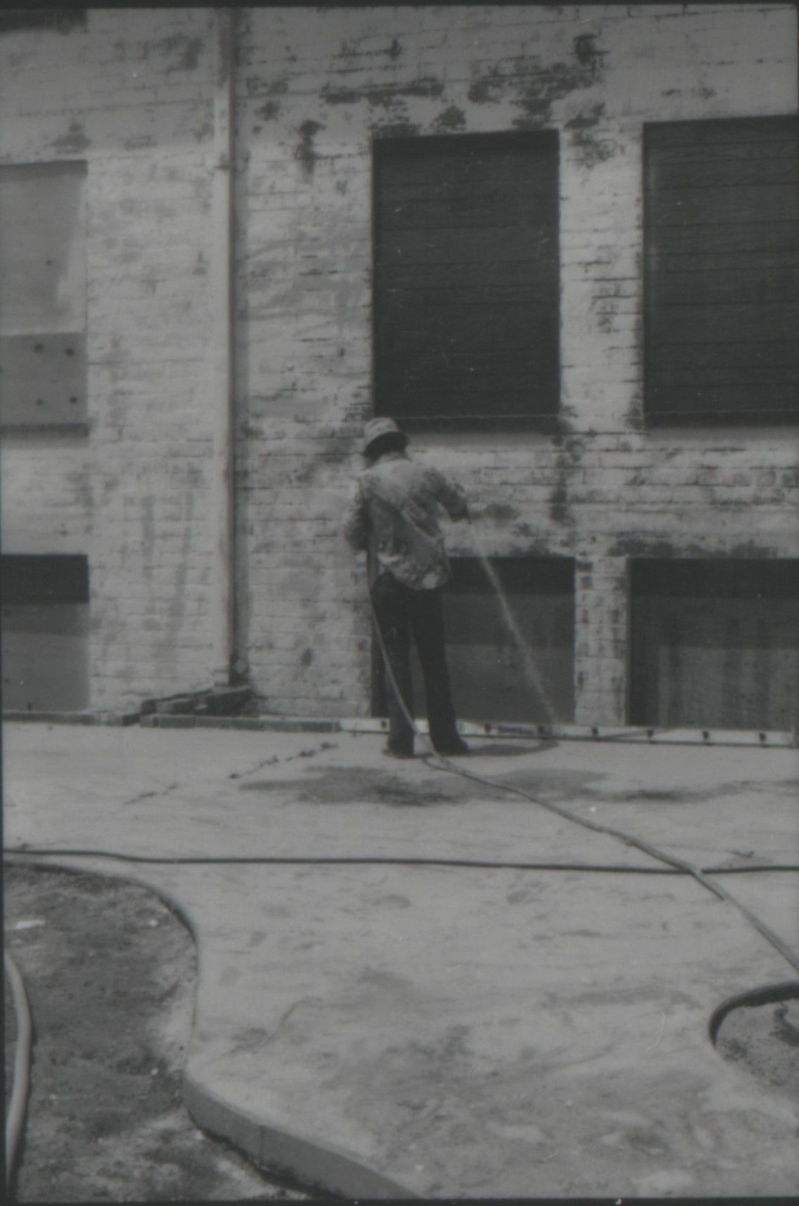 Boulder Dam Hotel exterior renovations: sand blasting 1980; neg. 0285; Dennis McBride photosLexicon