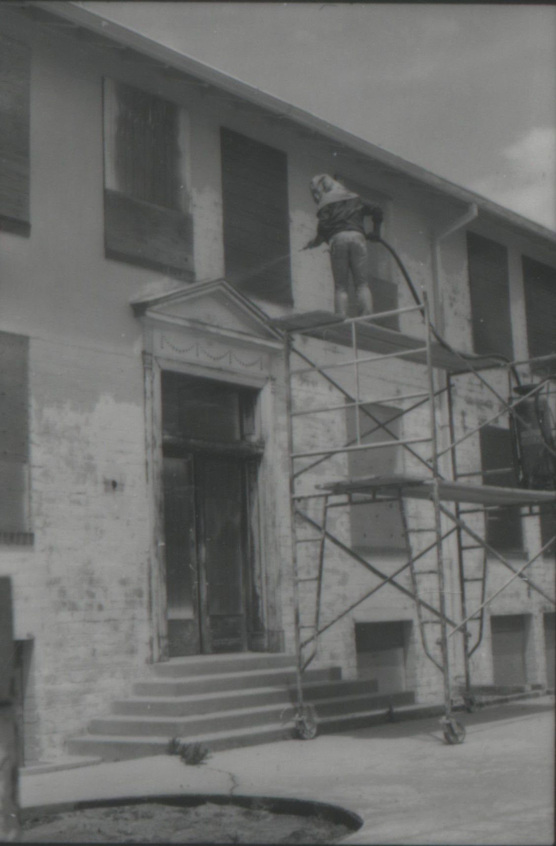 Boulder Dam Hotel exterior renovations: sand blasting 1980; neg. 0283; Dennis McBride photosLexicon