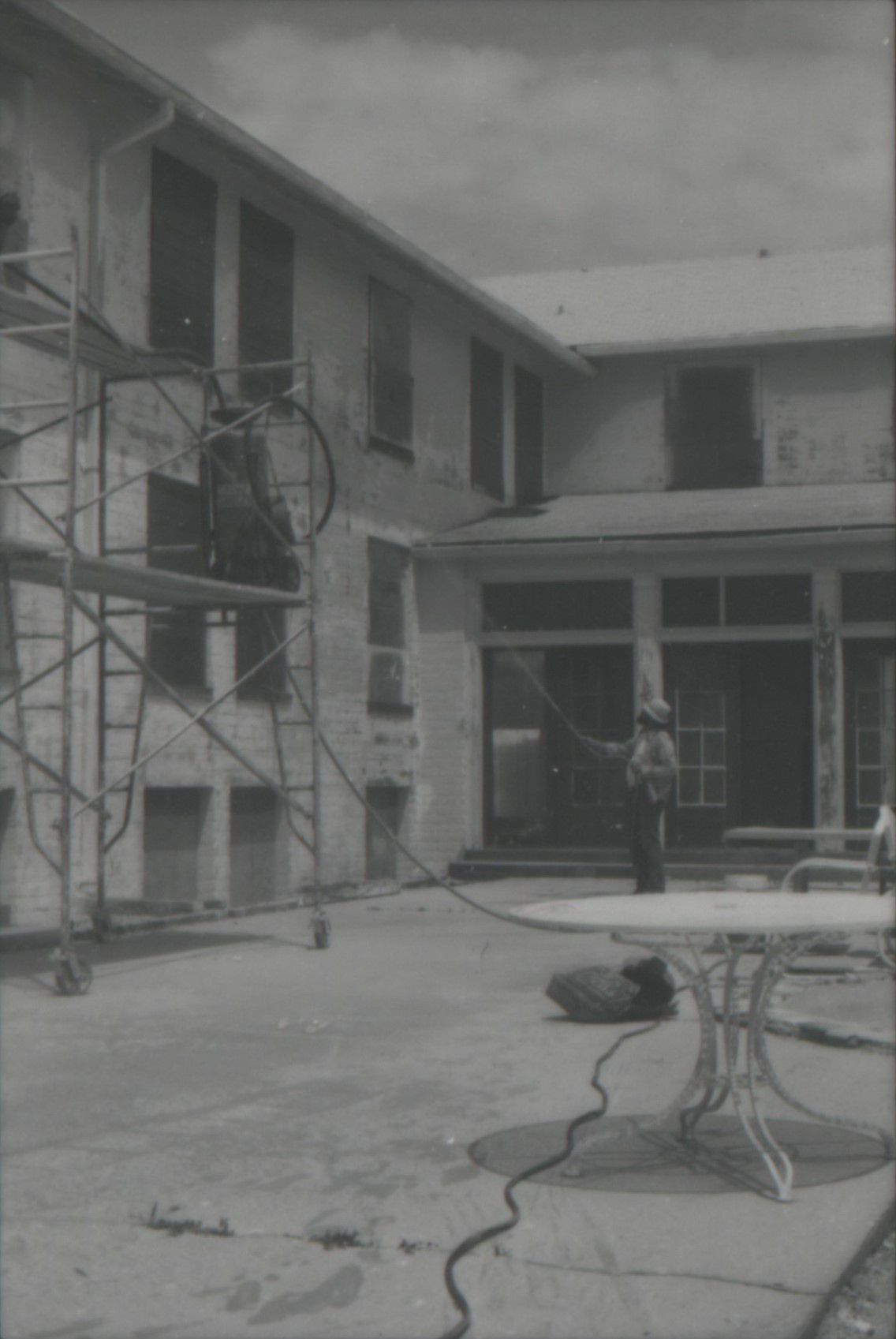Boulder Dam Hotel exterior renovations: sand blasting 1980; neg. 0282; Dennis McBride photosLexicon