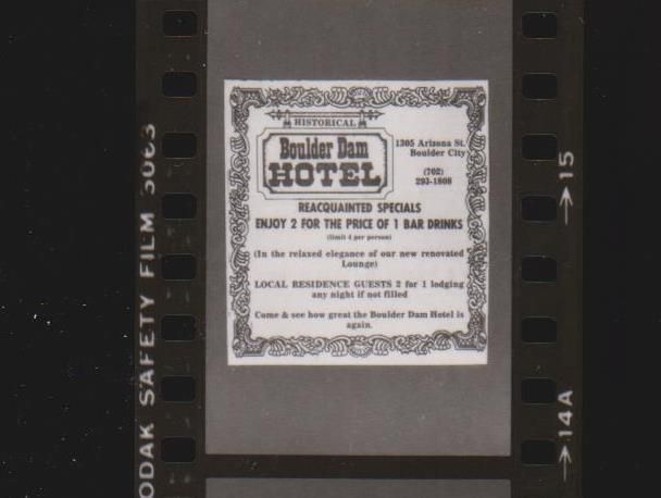 Boulder Dam Hotel; 2-for-1 bar drinks in the cocktail lounge July 1983Entry/Object ID