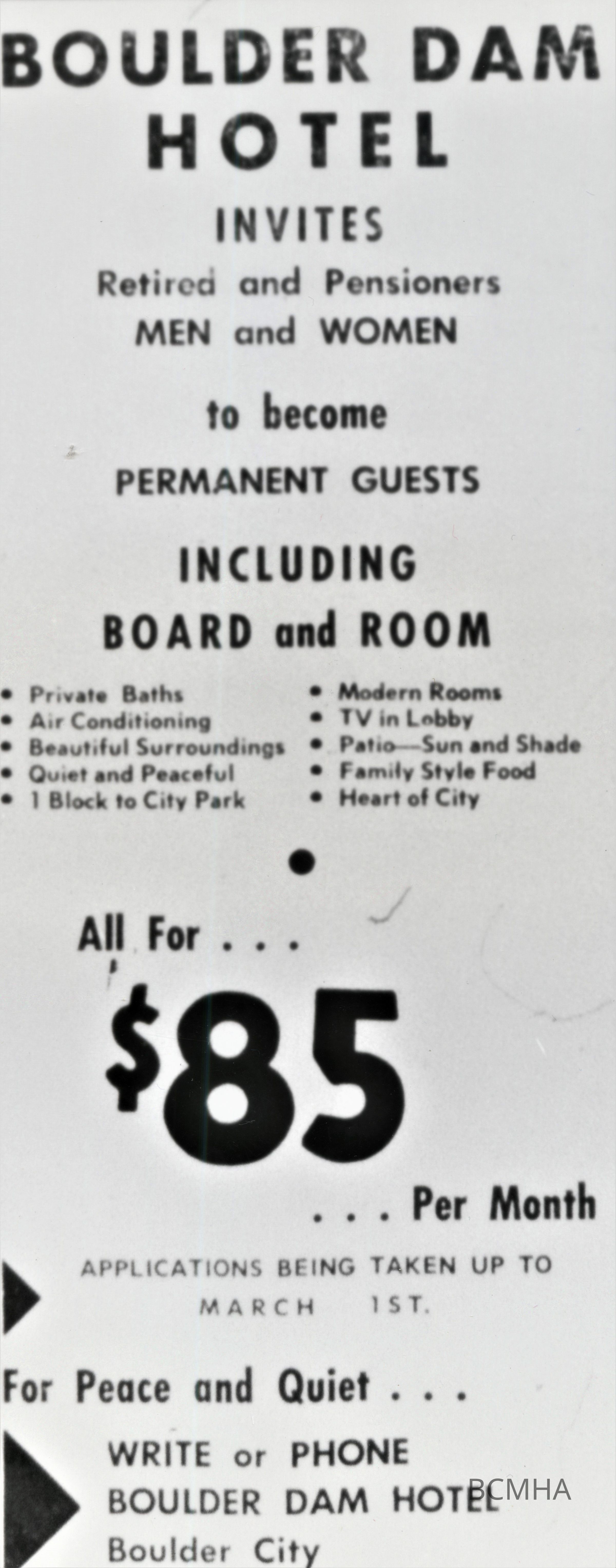 Boulder Dam Hotel advertisement as a retirement home; Boulder City News; February 20, 1958 p. 8Collection