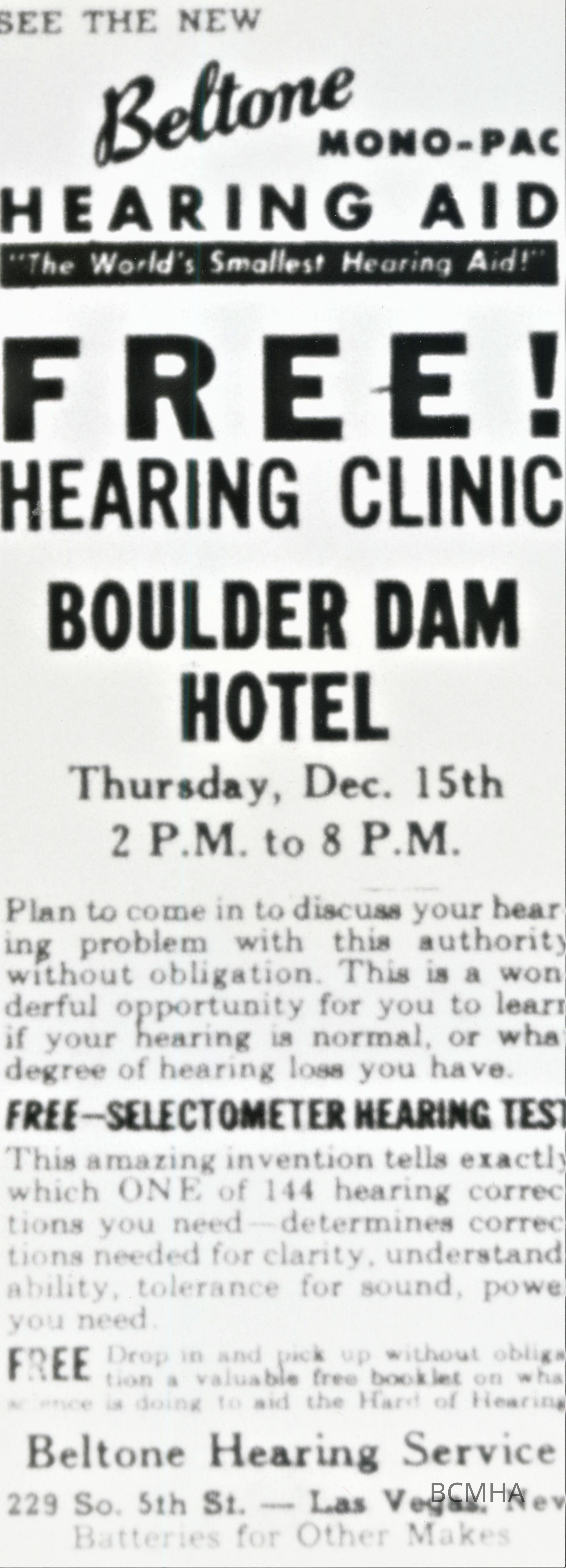 Boulder Dam Hotel advertisement for a Beltane Hearing Aid hearing clinic at the Boulder Dam Hotel; on December 15, 1949; Boulder City News; December 2, 1949 p. 3Collection