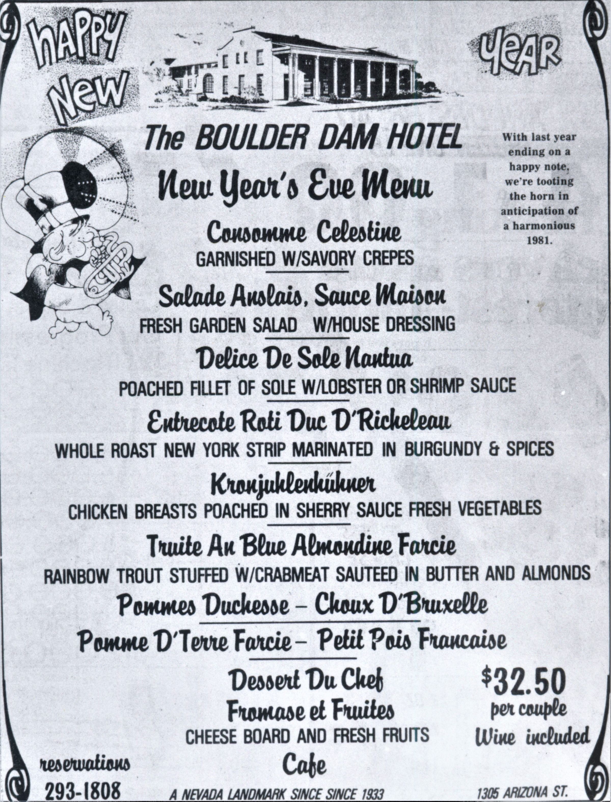 Boulder Dam Hotel- advertisement: New Year's Eve menu, December 25, 1980Entry/Object ID