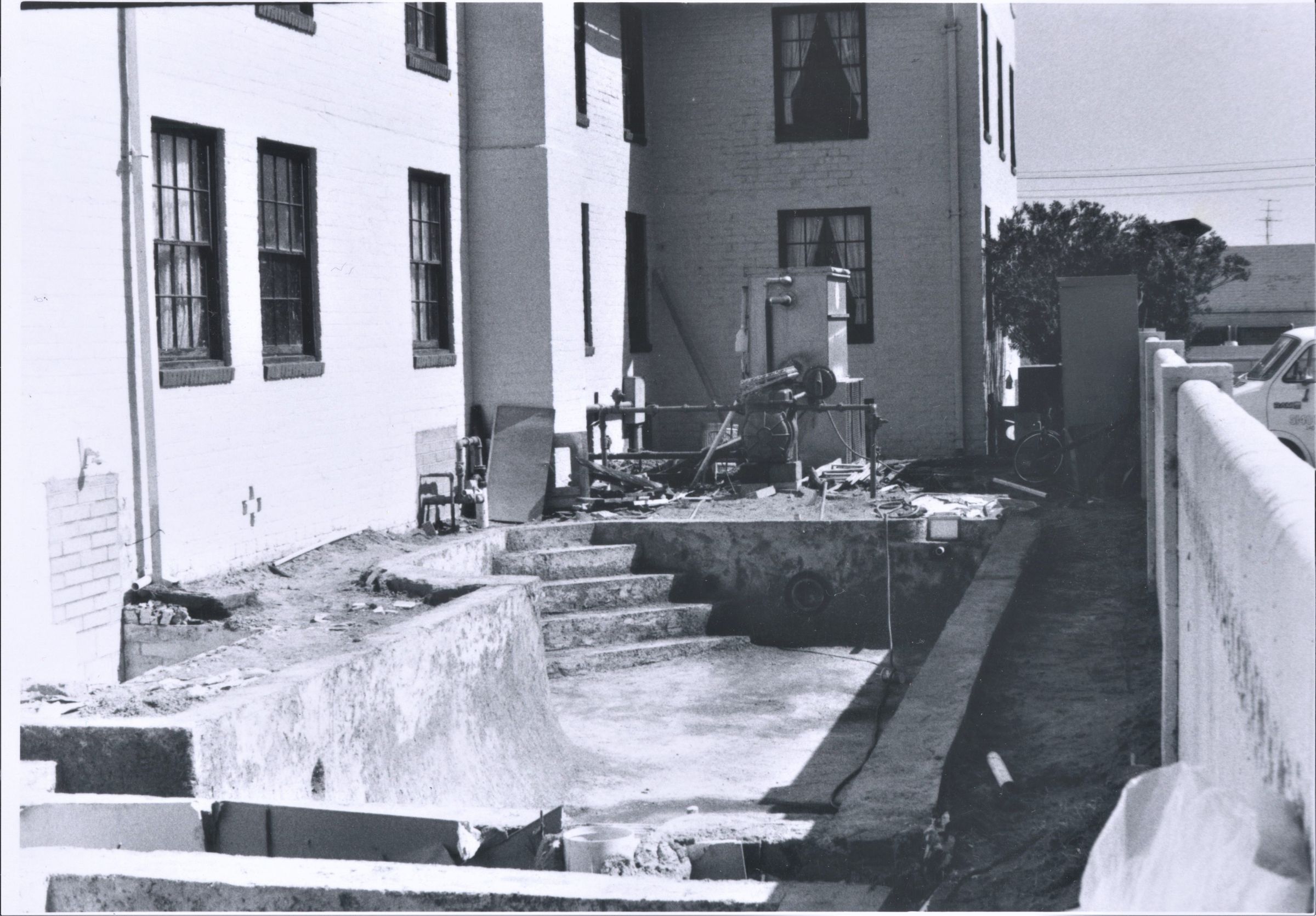 Boulder Dam Hotel April 1986 pool and Jacuzzi: construction, west side of hotel and gift shop construction-neg. 0436Entry/Object ID