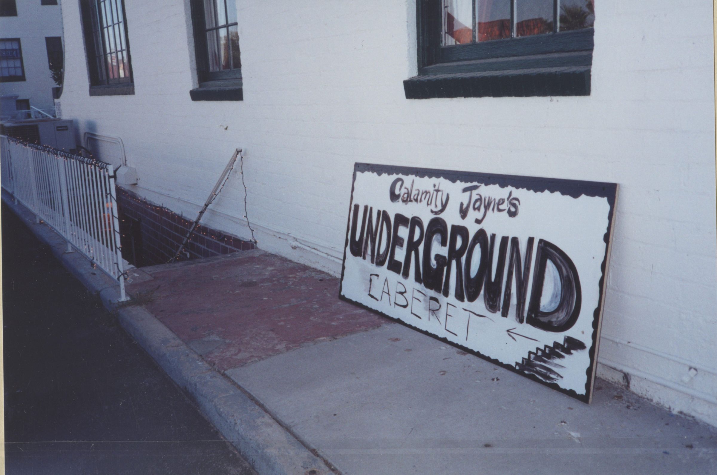 Calamity Jayne's Underground Caberet at the Boulder Dam Hotel; sic; grand opening night with hand-drawn sign; in color; July 21, 2000; Dennis McBride photoLexicon