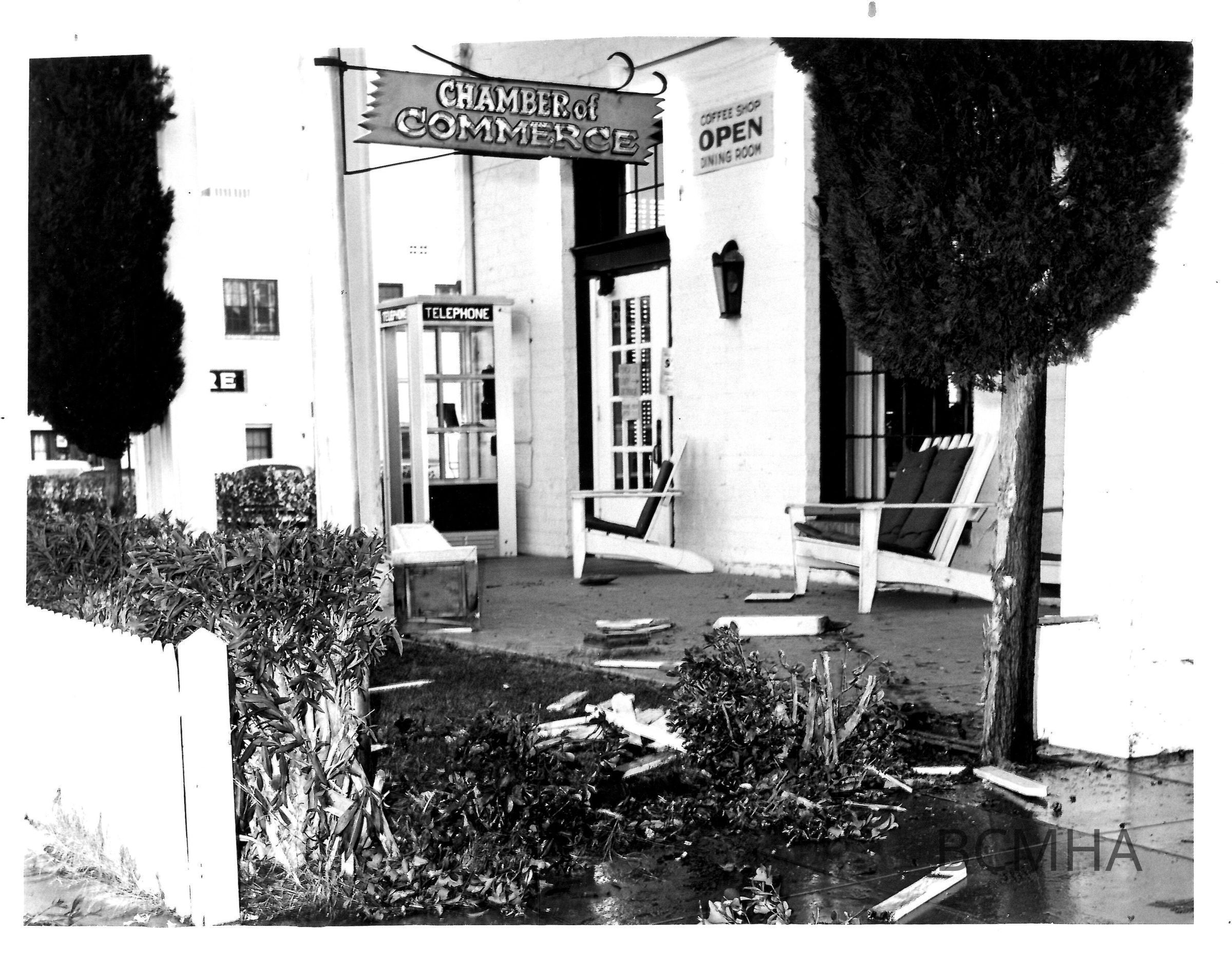 Boulder Dam Hotel- Chamber of Commerce sign; debris from a car wreck in the front of the hotel, 1960sCollection