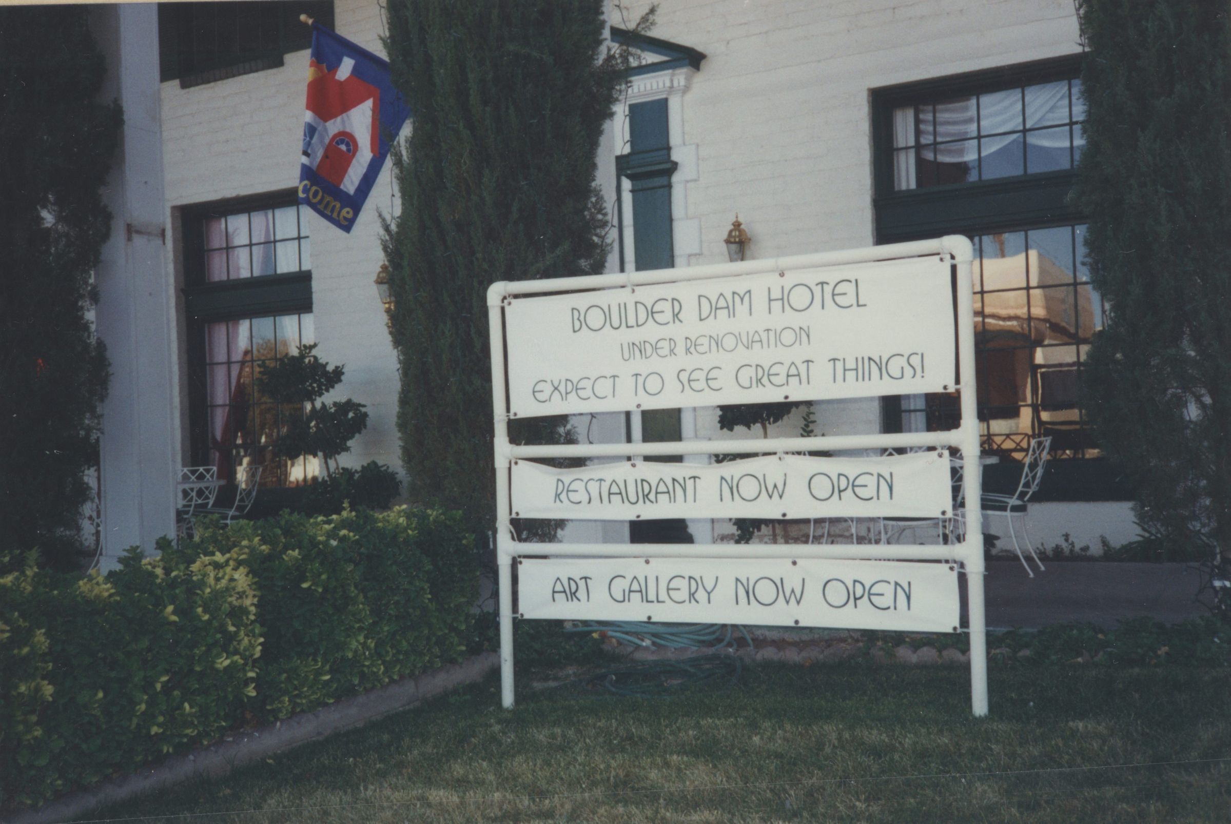 Boulder Dam Hotel renovation sign;" Restaurant now open sign"; "Art Gallery now open sign" January 9, 1997; Dennis McBride photosCollection