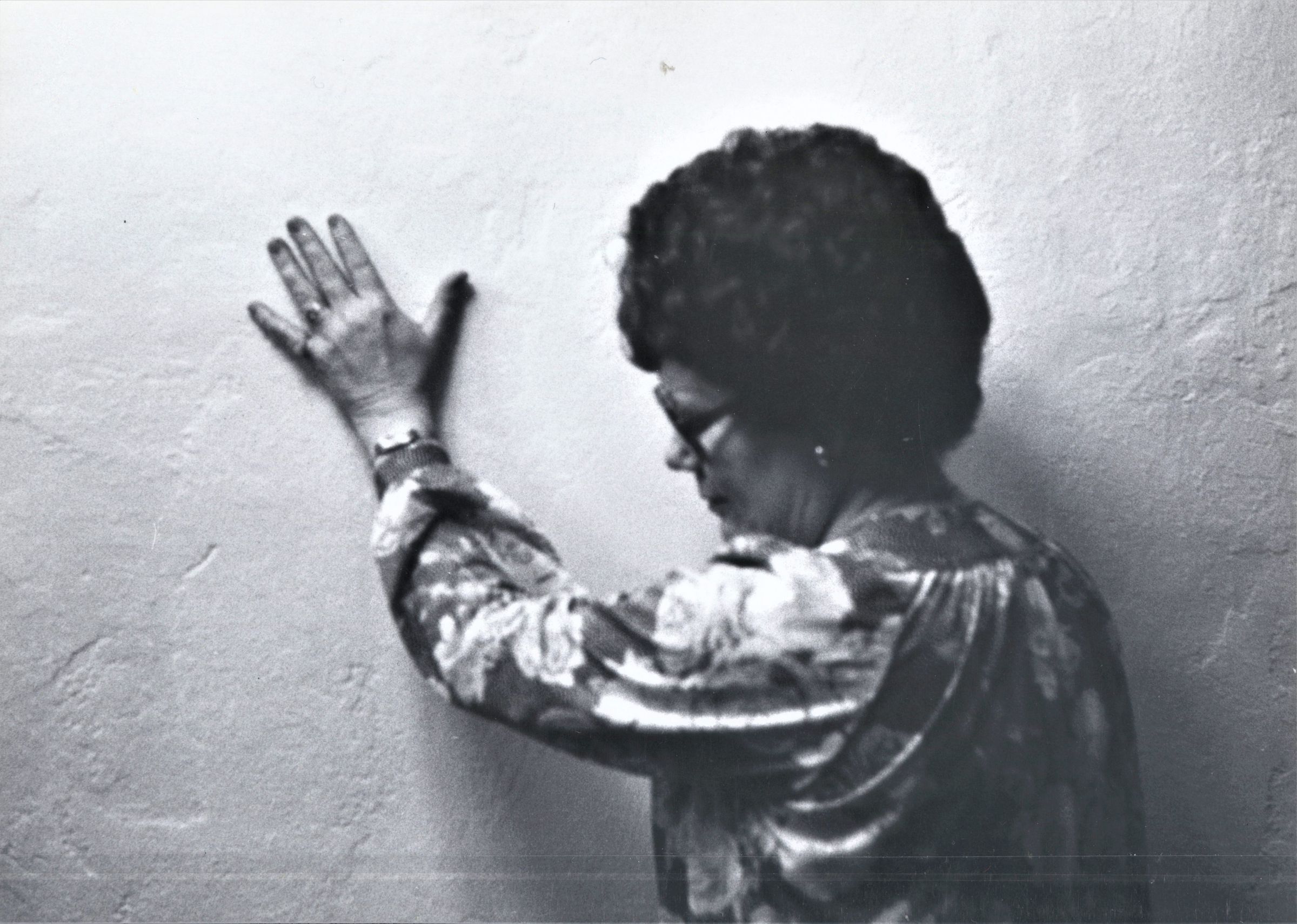 Boulder Dam Hotel; Las Vegas psychic Patsy Welding; reads a spot on the first floor landing by the wall mounted mirror; August 16, 1980; Dennis McBride photoCollection