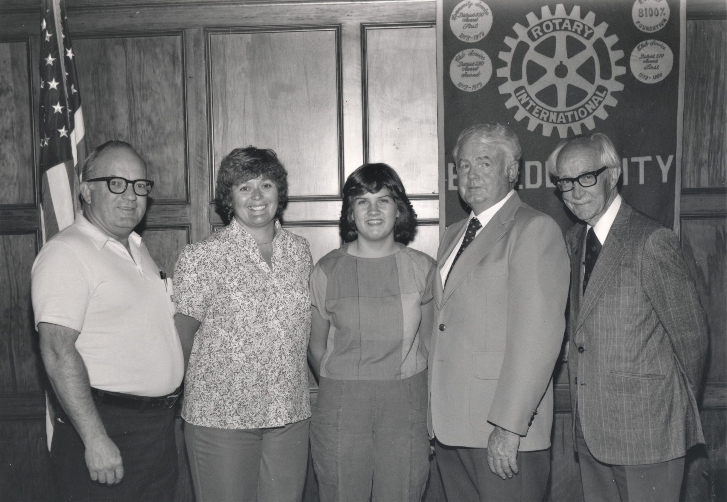Boulder Dam Hotel lobby; Peace Seekers' Clipper Club contest winner ca. 1981; from left-right; Darrell McGarvey; Boulder City Rotary Club Peace Plaque Chairman; Candice Kelley; Elton and Madelaine Garrett Junior High School instructor; Jodi Beneda; Contest Winner; Dorrell Booth; Garrett Junior High School Principa; Elton Garrett; originator of the Peace PlaqueCollection