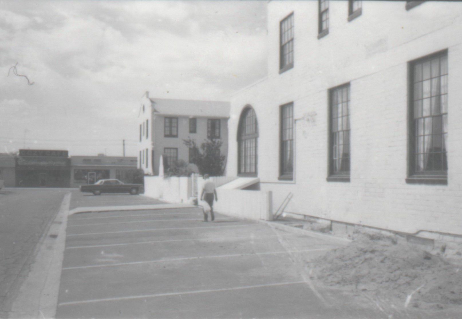 Boulder Dam Hotel; exterior renovations; May 12, 1987; neg. 0373; preparing to build a sidewalk to the staircase down into the cocktail lounge staircase; Dennis McBride photosLexicon