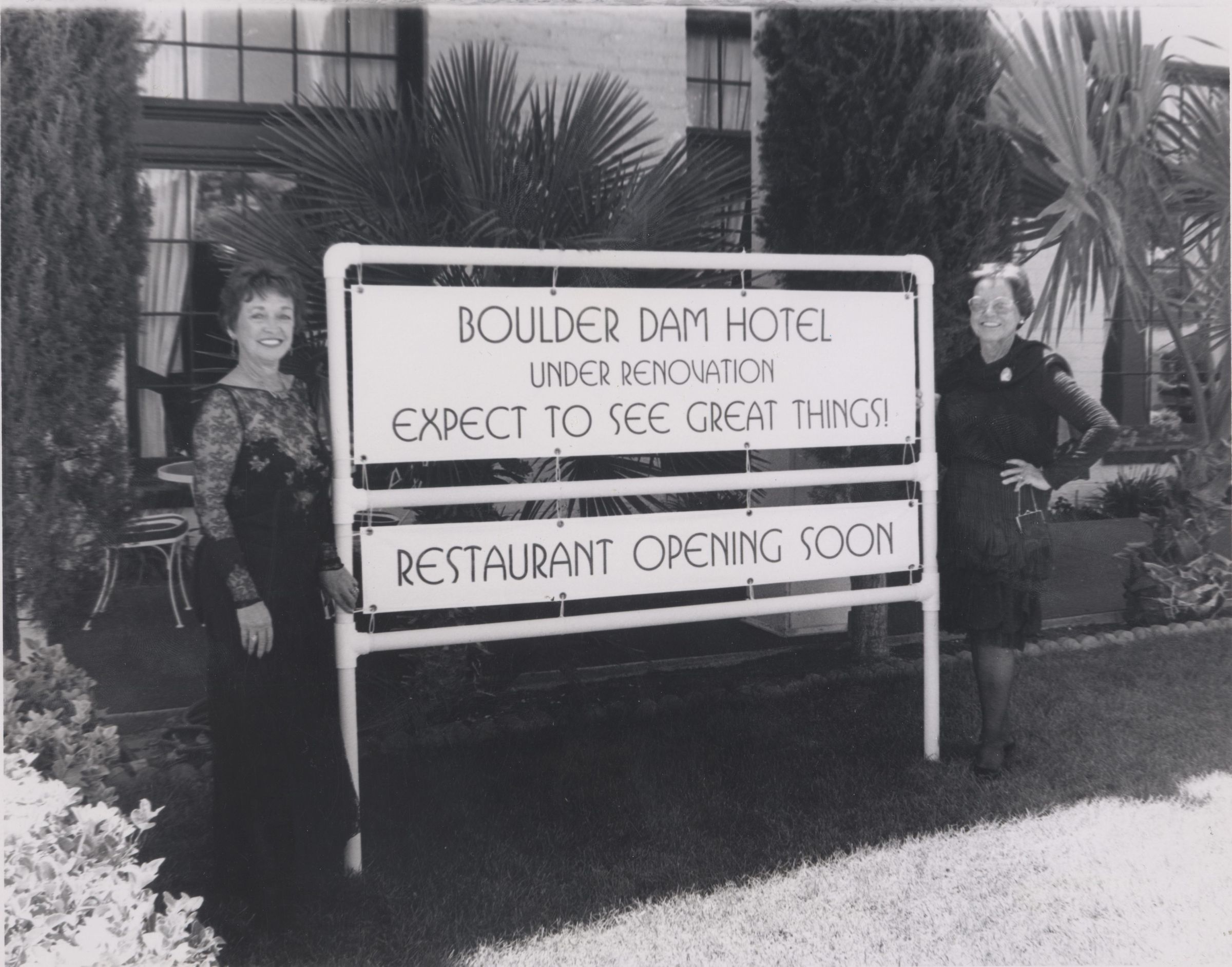 Boulder Dam Hotel Renovation sign with Iris Bletsch standing on the left and Gene Segerblom standing on the right; May 1994Collection