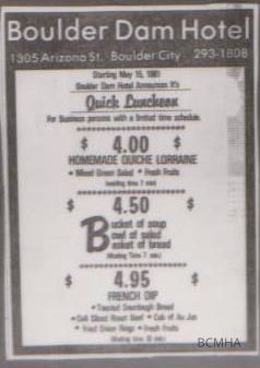 Boulder Dam Hotel;"Quick Luncheon" advertisement; neg. 0638; BCN; May 14, 1981; Dennis McBride photosLexicon