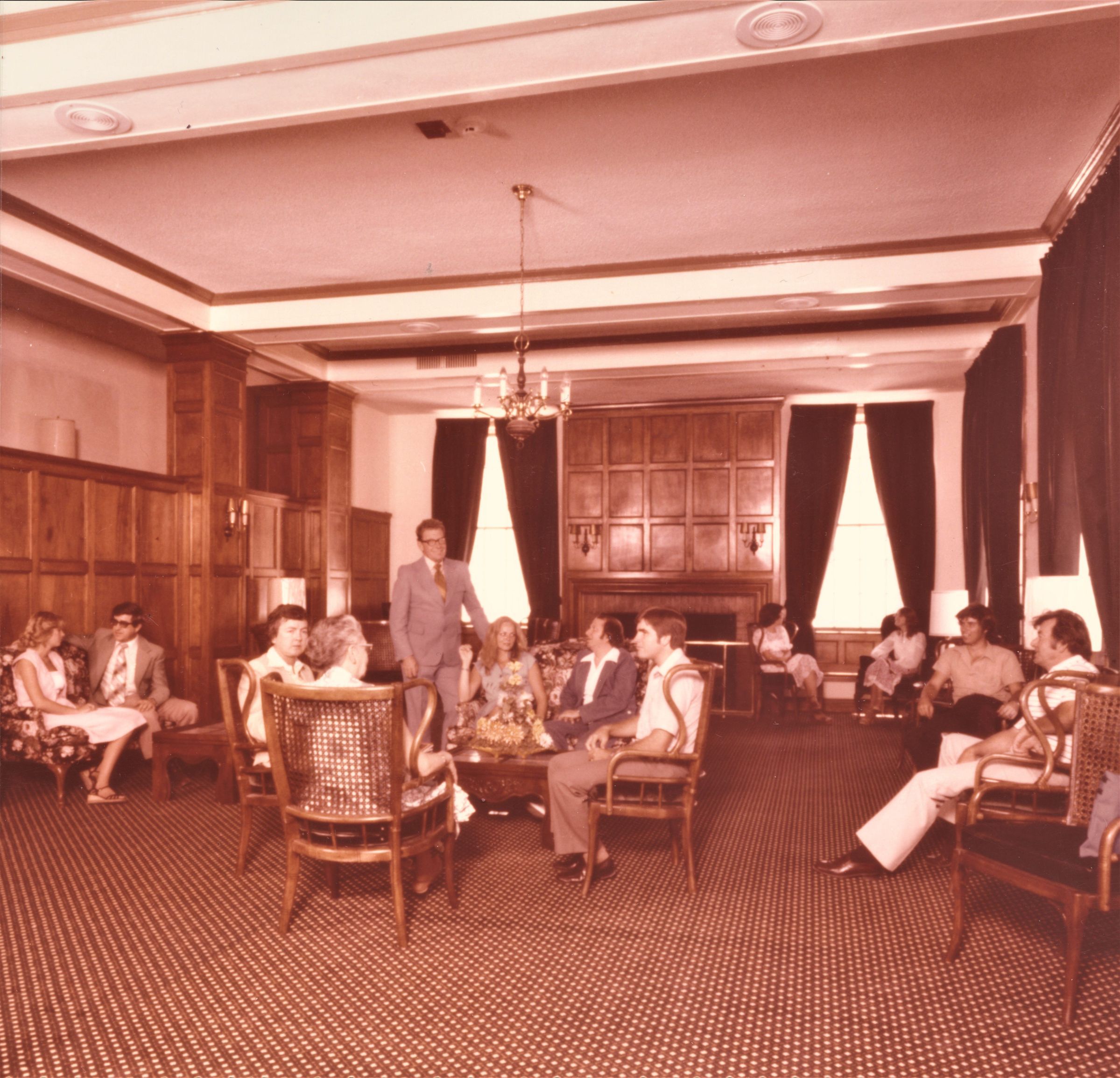 Boulder Dam Hotel; refurbished lobby; 1980; l-r: ?; with John Vassiliades; ?; ?; ?; Jeanette Slack; hotel manager Paul Wolfram;Collection