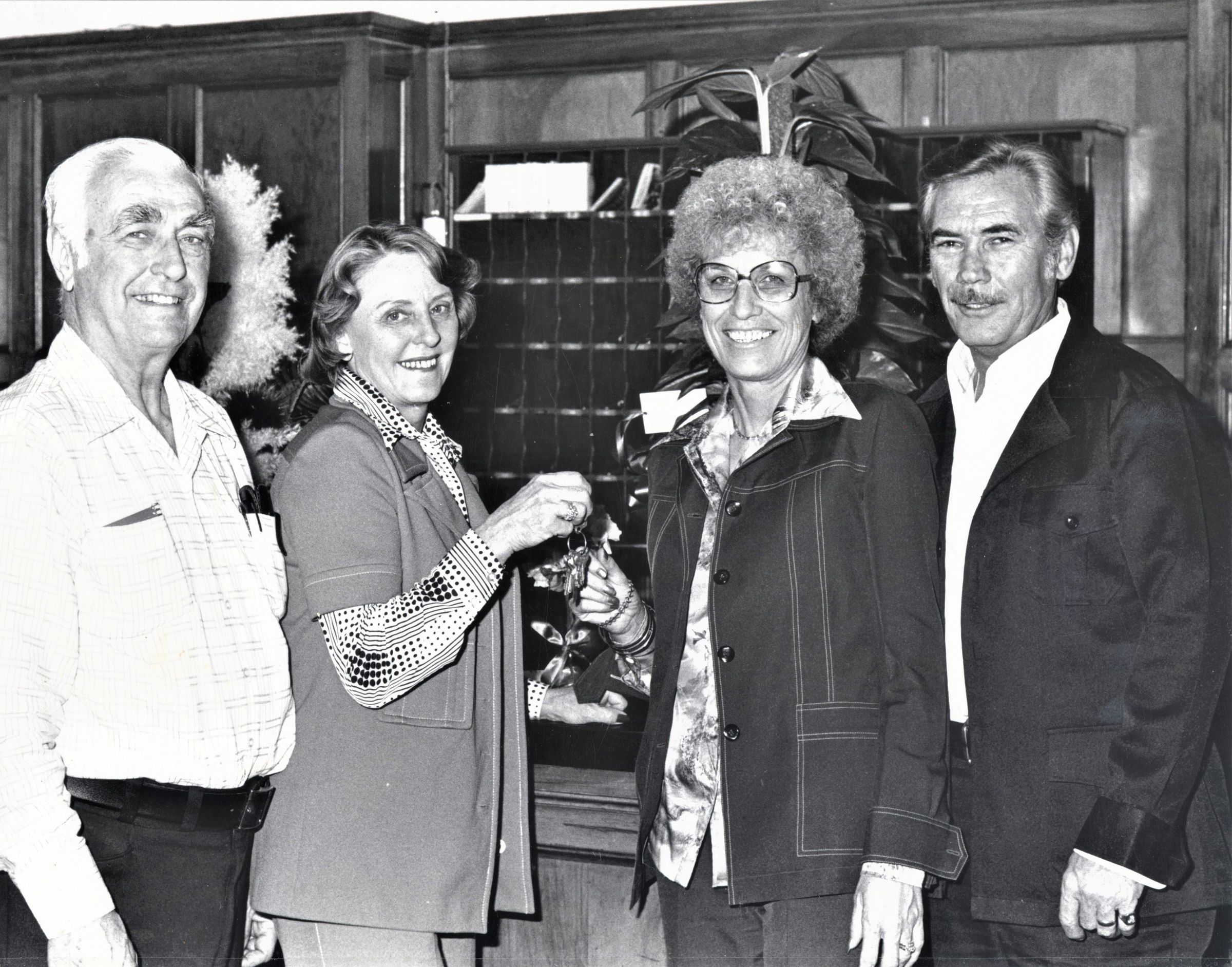 l-r: Bob Beaugureau; Lois Beaugureau; Ruby Adams; Frank Adams: the Beaugreaus sold the Boulder Dam Hotel; to the Adamses; photo taken April 5, 1978; Boulder City Hotel; Said 'Dining Room to Re-open," in the Boulder City News; April 13, 1978; p. 1Collection