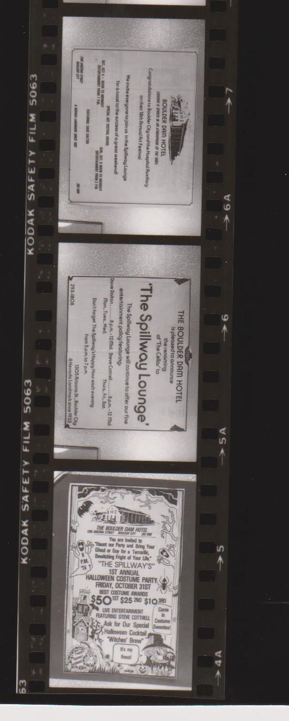 Boulder Dam Hotel; Spillway advertisements for the cocktail lounge; and special events; 1980-81; neg. 0633; Dennis McBride photosLexicon