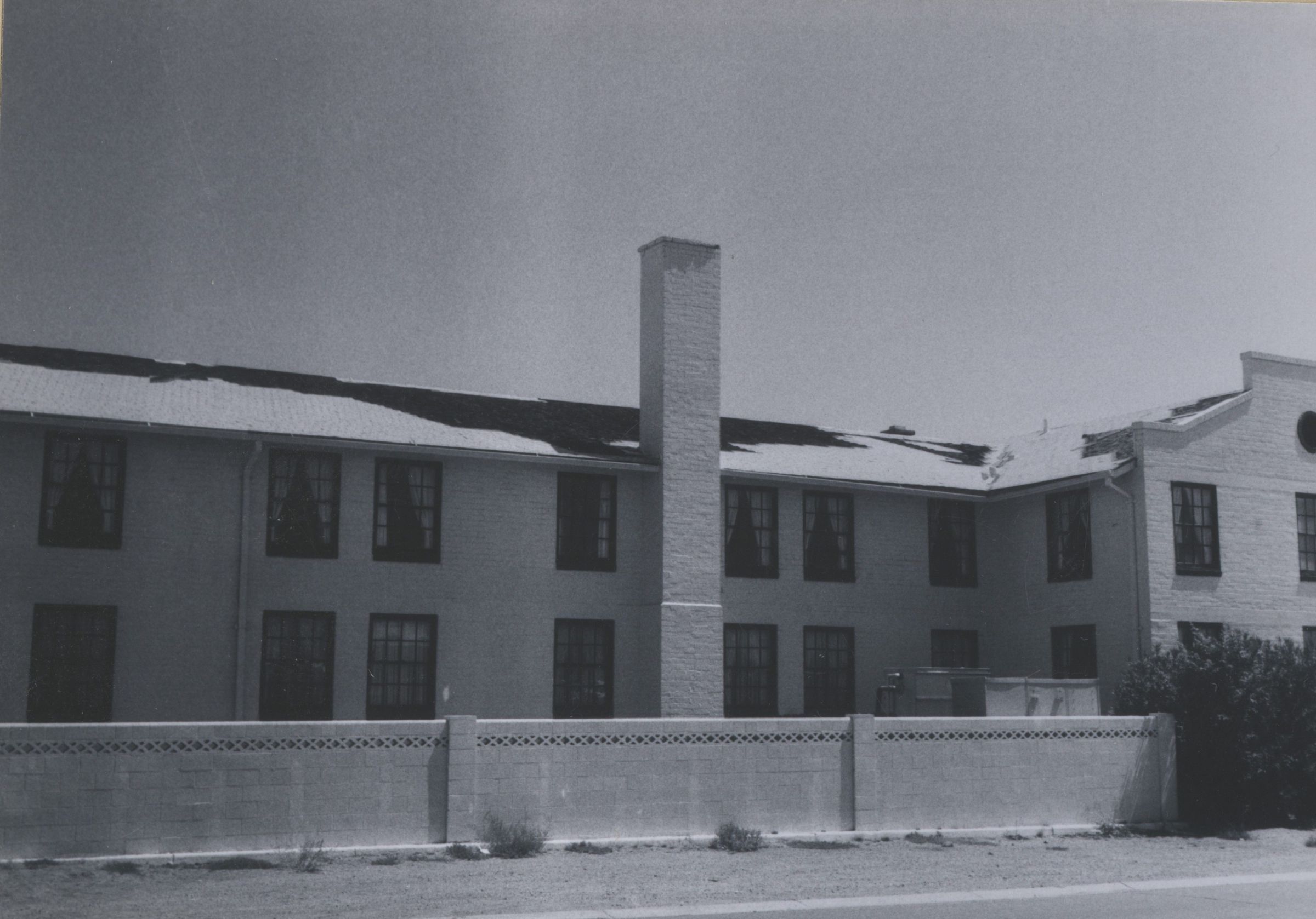 Boulder Dam Hotel storm damage to roof, July 1983; negative image #7a; Dennis McBride photosCollection