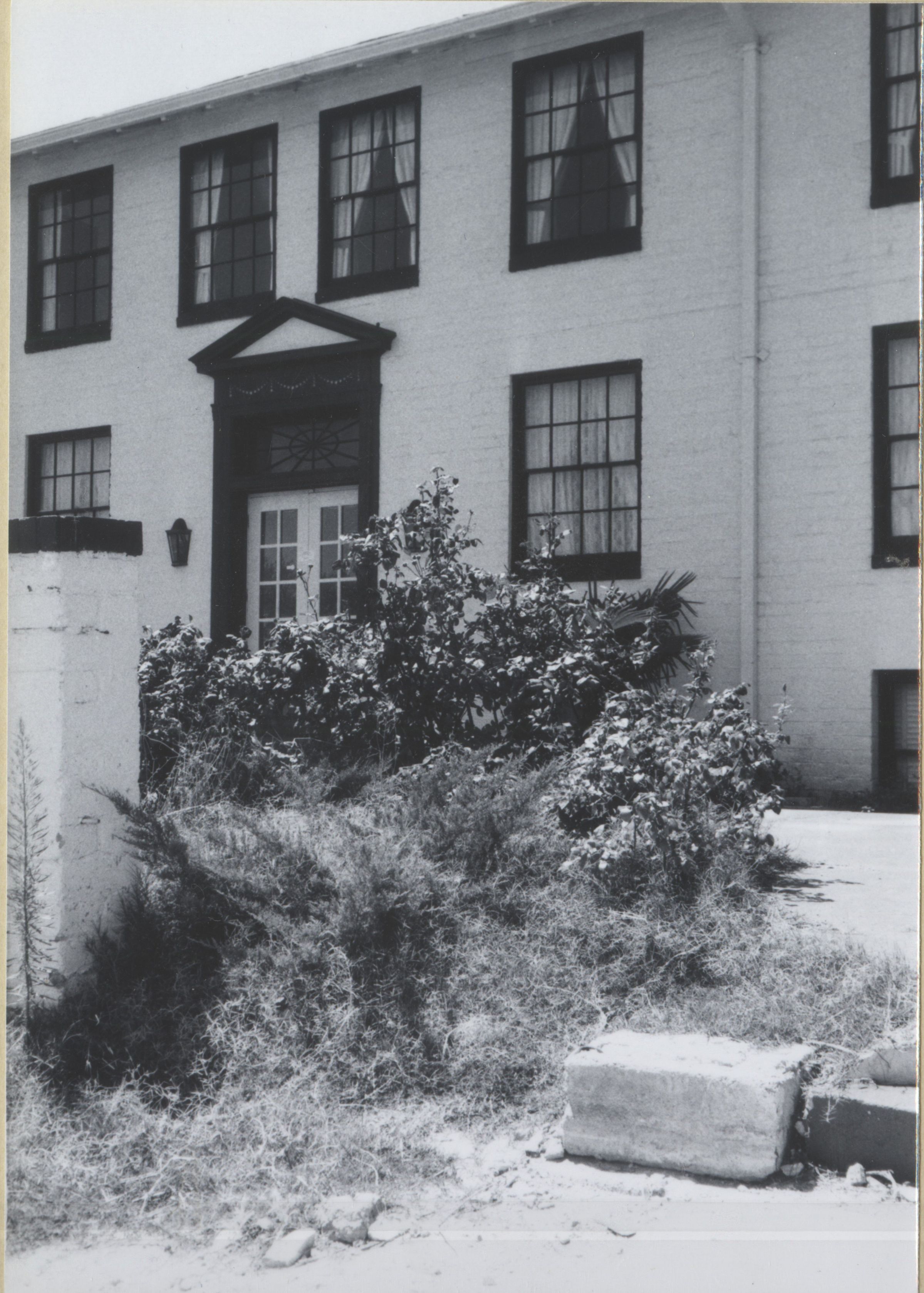 Boulder Dam Hotel: storm damage to roof and gardens gone to seed July 1983; negative image #13a; Dennis McBride, photos: neg 13a, 14a, 15a: photo numbers 0095, 0096, 0097Collection