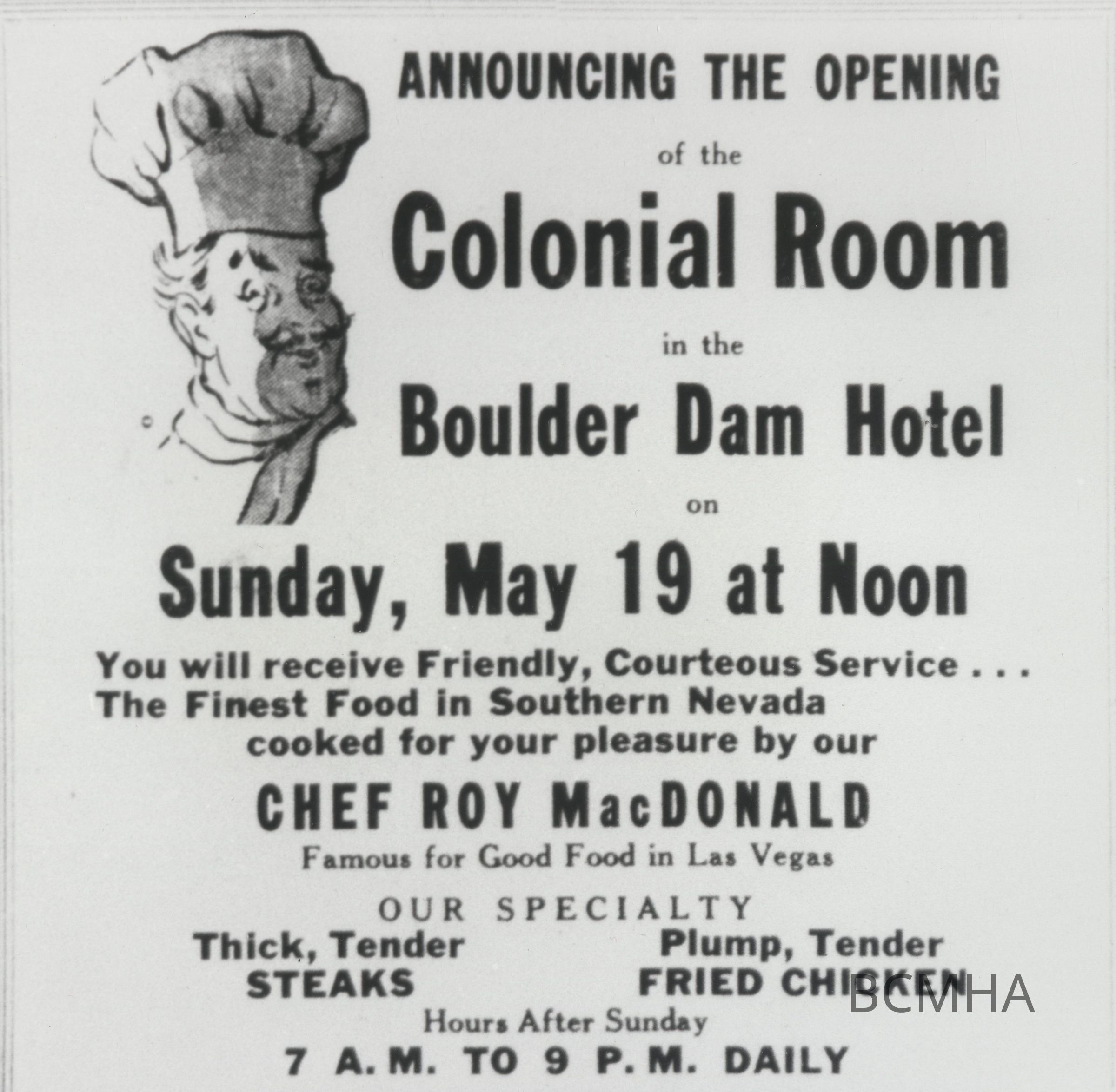 Boulder Dam Hotel dining room opening advertisement as the Colonial Room; Boulder City News; May 18, 1946; p.4Collection