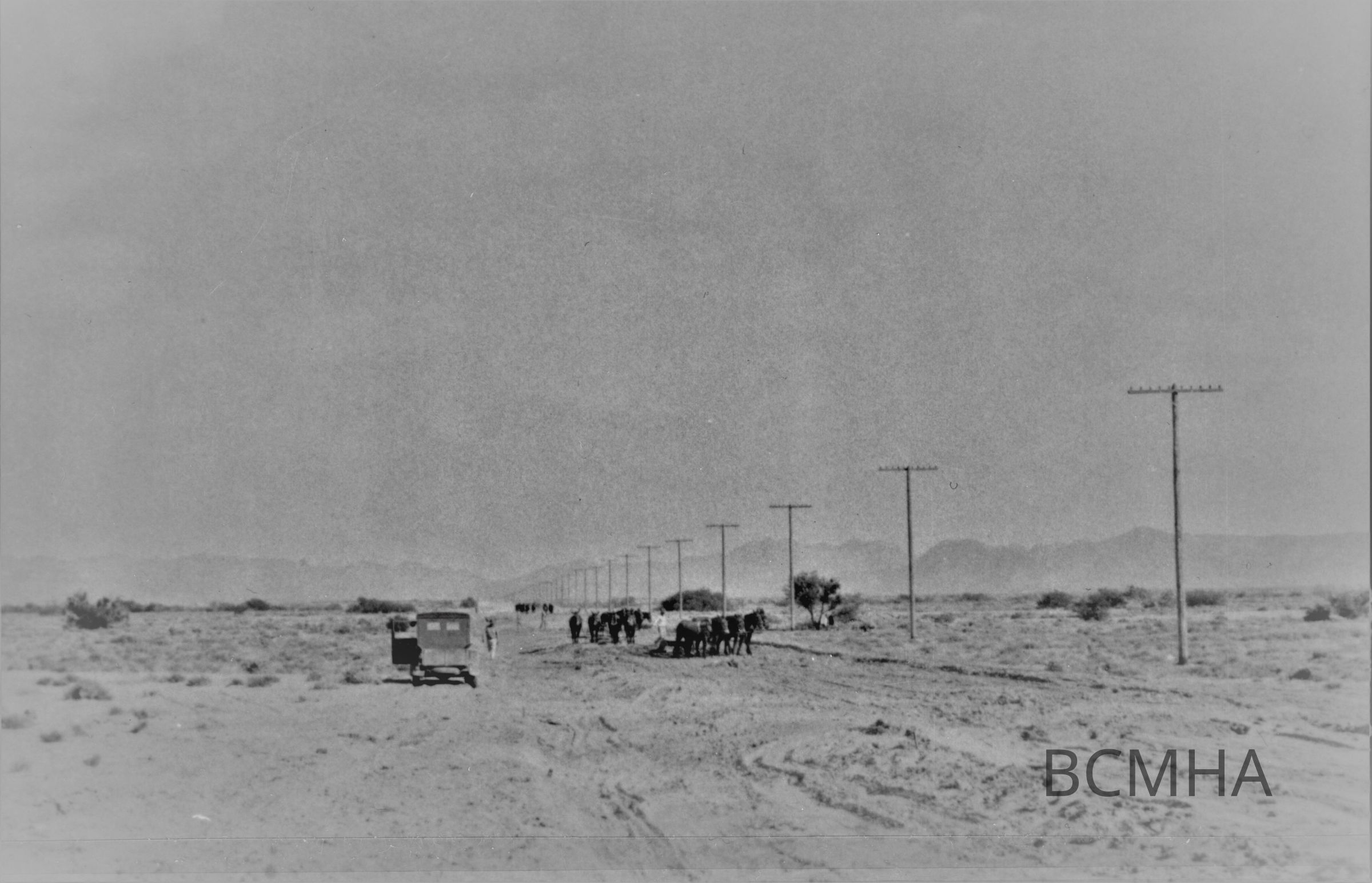 roads and streets; Boulder Highway construction; grading the roadbed with mules; 1931; Boulder City Library; Graphic Views of Hoover Dam; photo no. 76; Winthrop A. Davis, photographerCollection