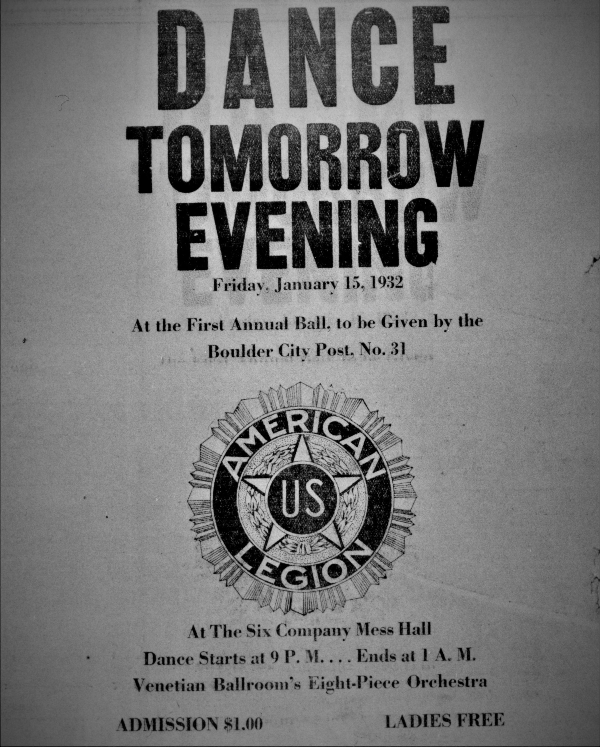 Boulder City clubs and organizations: American Legion Post 31: advertisements: 1st Annual Ball, January 15, 1932; Las Vegas Evening Review - Journal, Jan. 14, 1932, p. 4Collection