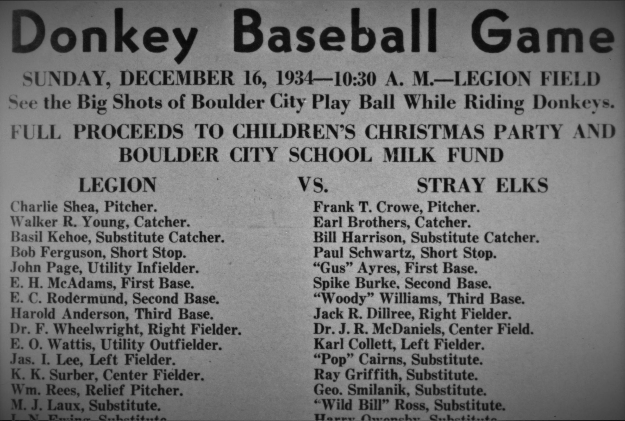 Boulder City sports and recreation: Donkey Baseball game program, December 16, 1934; this program is stored in posters & broadsides- box 1Collection