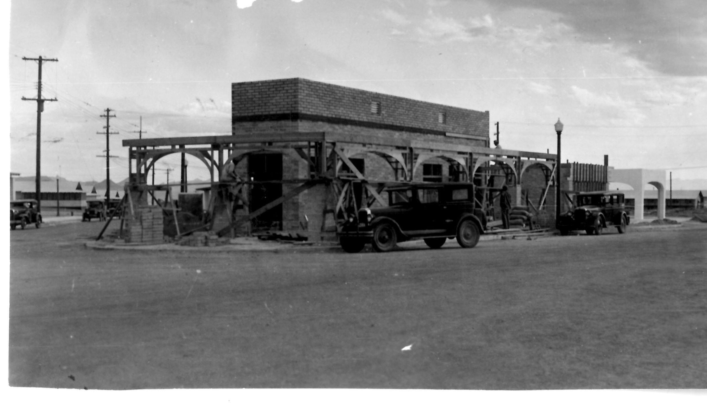 The Boulder (aka Barney Delmar's) Drugstore under construction on the corner of the NV. (Boulder) Hwy & Ave. B (left) 1932; Joe Manix photoMade/Created