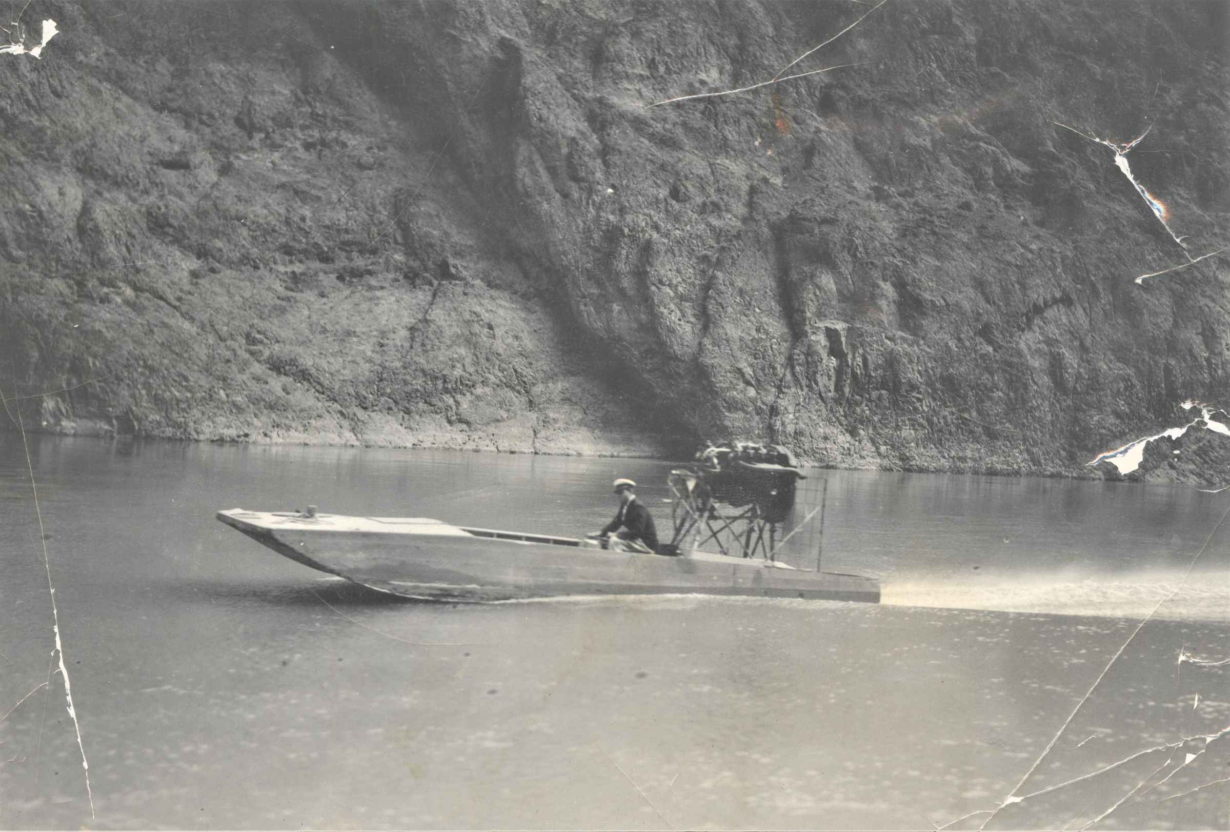 Colorado River - Murl Emery's airplane engine-powered flat boat, the Flying Fish, 1930s: "Murl Emery's air-propelled boat/ 1935, Black Canyon below dam." [see MS 10]Collection