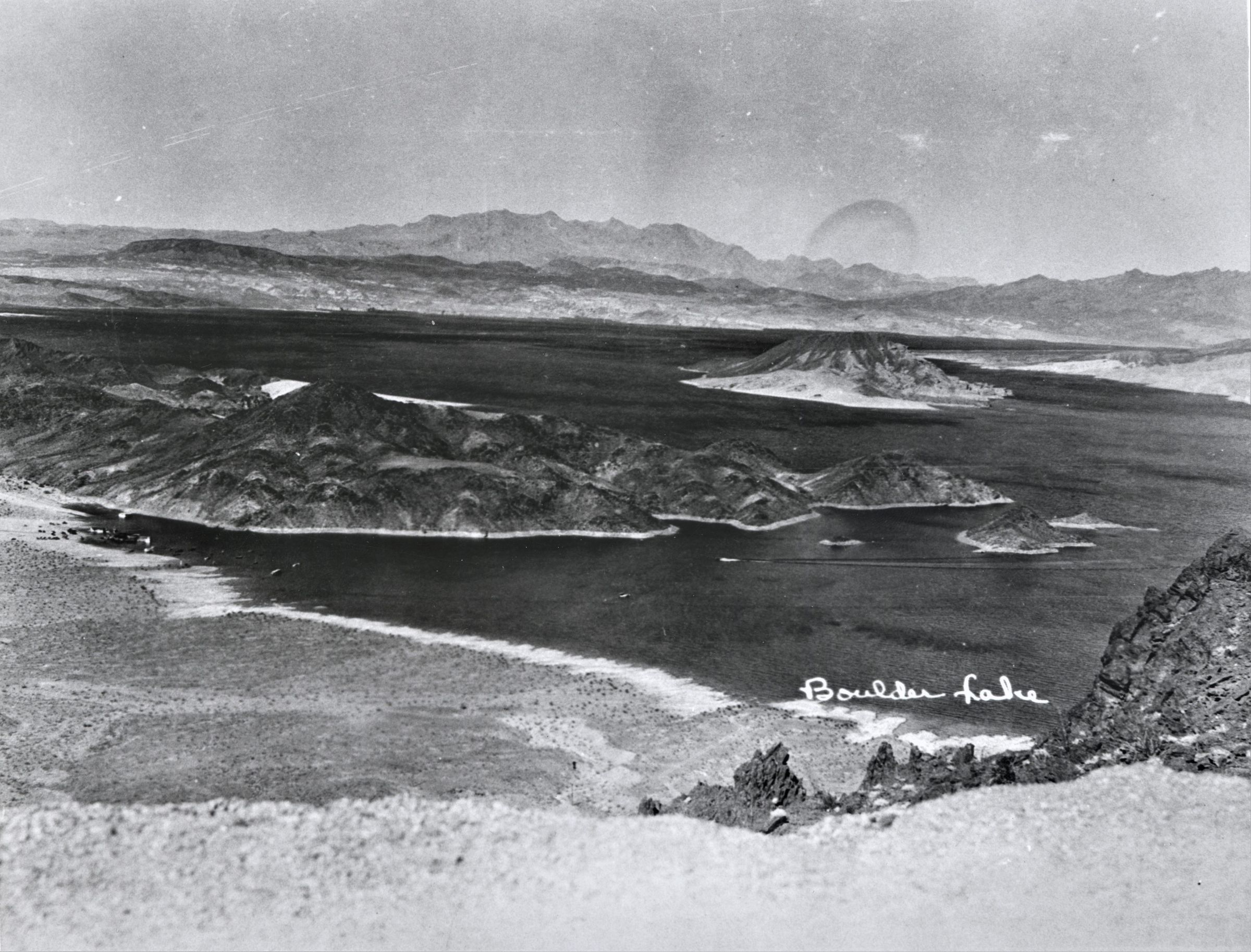 Lake Mead in early stages of filling. Sentinel Island right of center in photo. August 1935; USBR photo; Copy Negative from Outside CollectionCollection