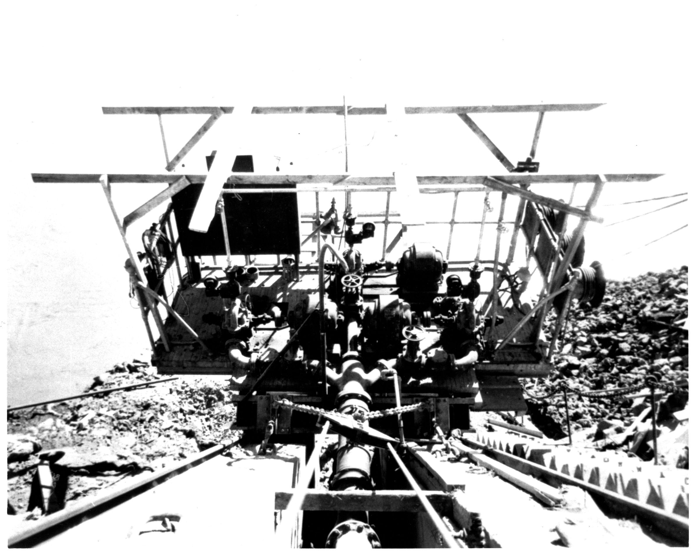 Boulder City water system: Extension of water pipe to upper batch plant. BC water supply. movable pump on the shore of the Colorado River in Black Canyon, c. 1932-35; UNLV Library - Special Collections Copy Negative; UNLS - Cutright Collection; 0123:0071Collection