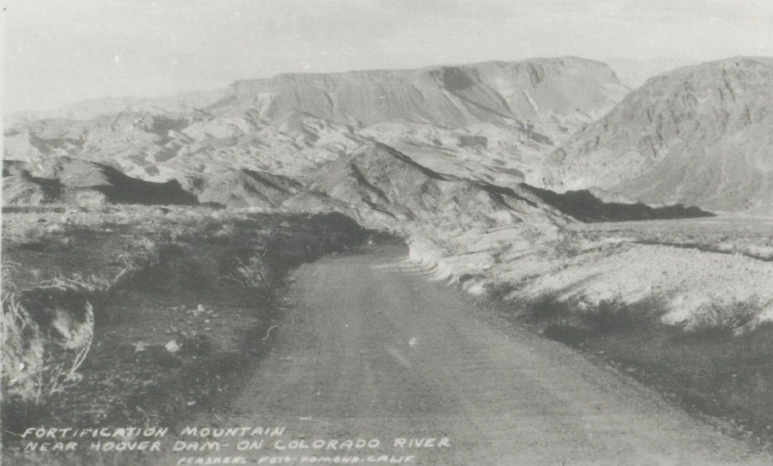 Hoover Dam roads: U.S. 93 through Hemenway Valley [aka Black Canyon Highway]: Fortification Mountain near Hoover Dam - on Colorado River, c. 1930-31; Frashers Fotos/Pamona, Calif. [neg]Collection