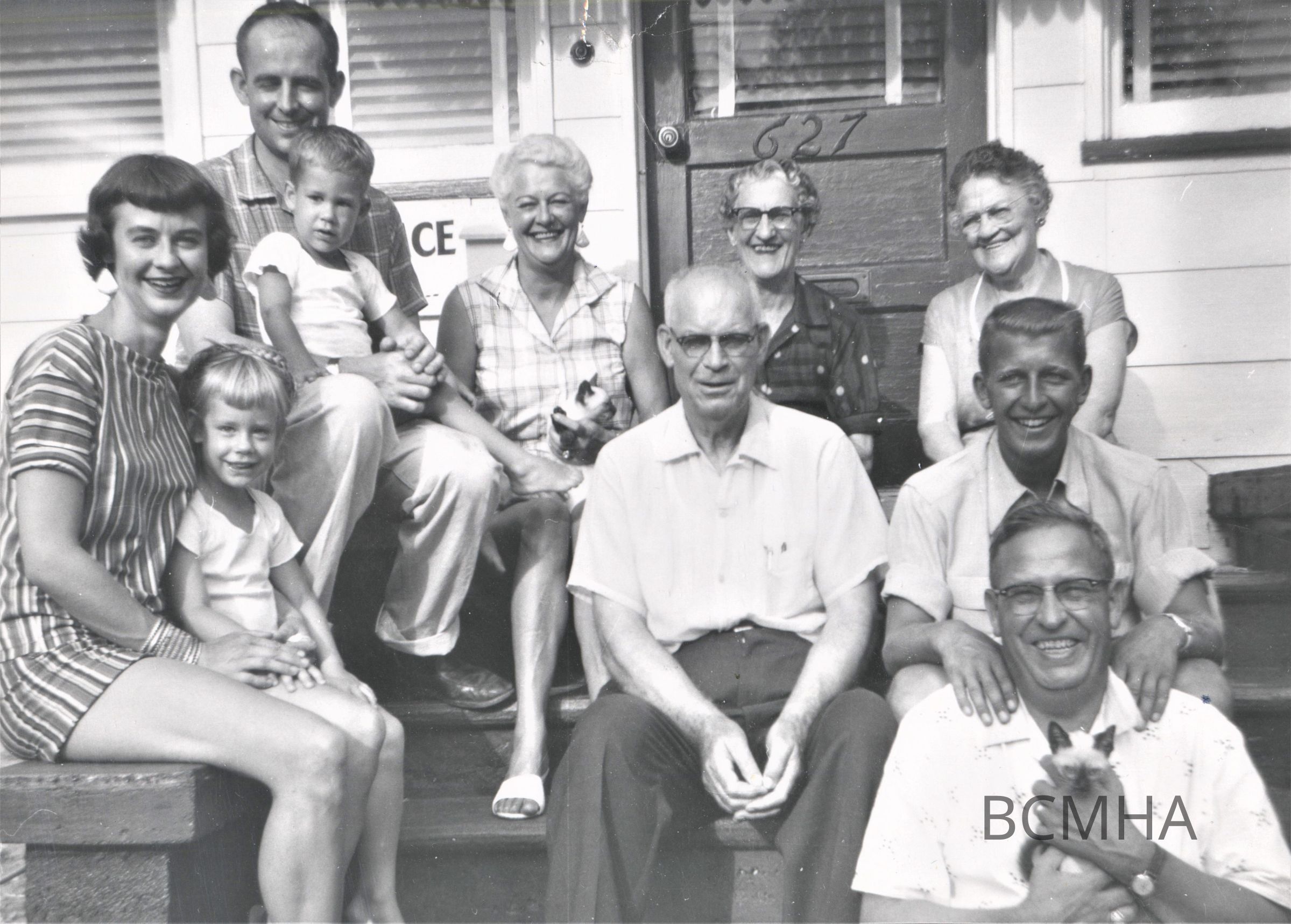 Charles and Mattie Peterson family at 627 Avenue B, c. 1950-60s [l-r: Duane [MacKay] Turner; Charles and Mattie's granddaughter, with her child, Scotty Turner; Austin Turner with son, Spike Turner; Lucille [Peterson] [MacKay] Weidner, Charles and Mattie's daughter; Charles F. "Chief" Peterson; Hattie Peterson; Louise Lane, Hattie's sister; Peter MacKay, Charles' and Hattie's grandson; George Weidner, Lucille's husband]; Boulder City News, January 9, 1975, p.7Collection