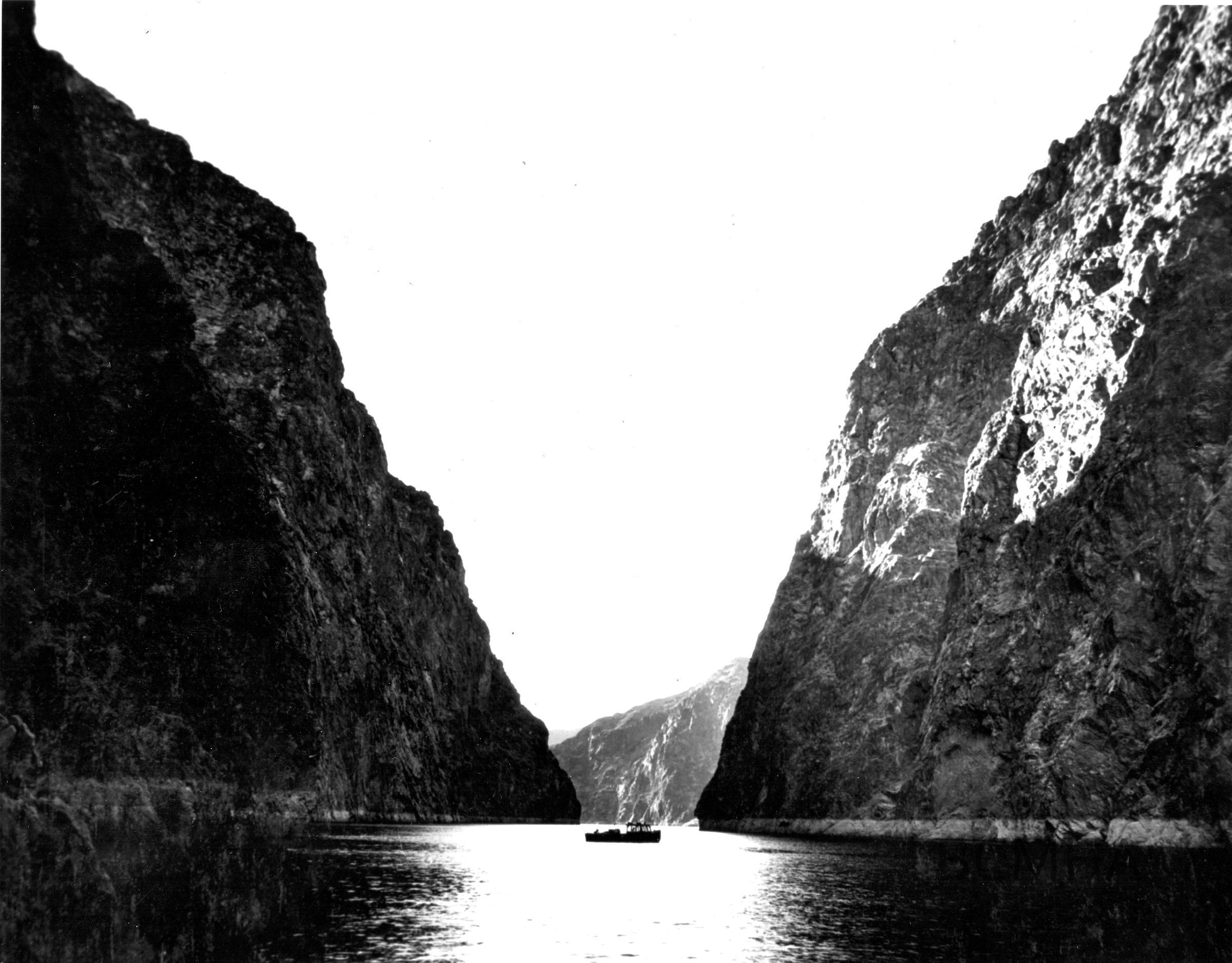 Colorado River - "View looking downstream through Boulder Canyon, the original site of the Boulder Dam. The expedition's boat is seen in the gap." 11-6-35 [photo by B. D. Glaha; Wash. no. 03340, Bureau of Reclamation Department of the InteriorCollection