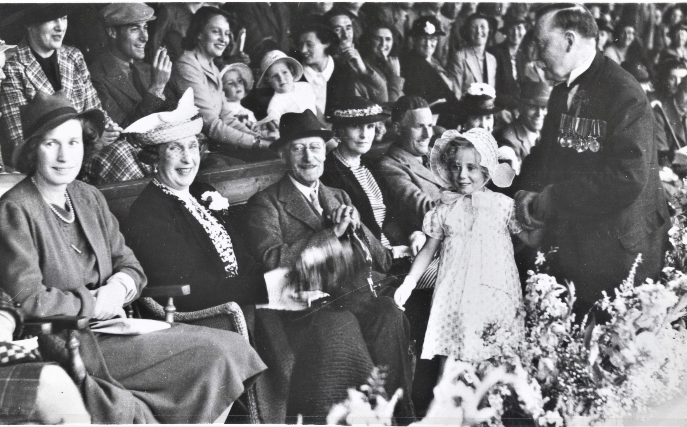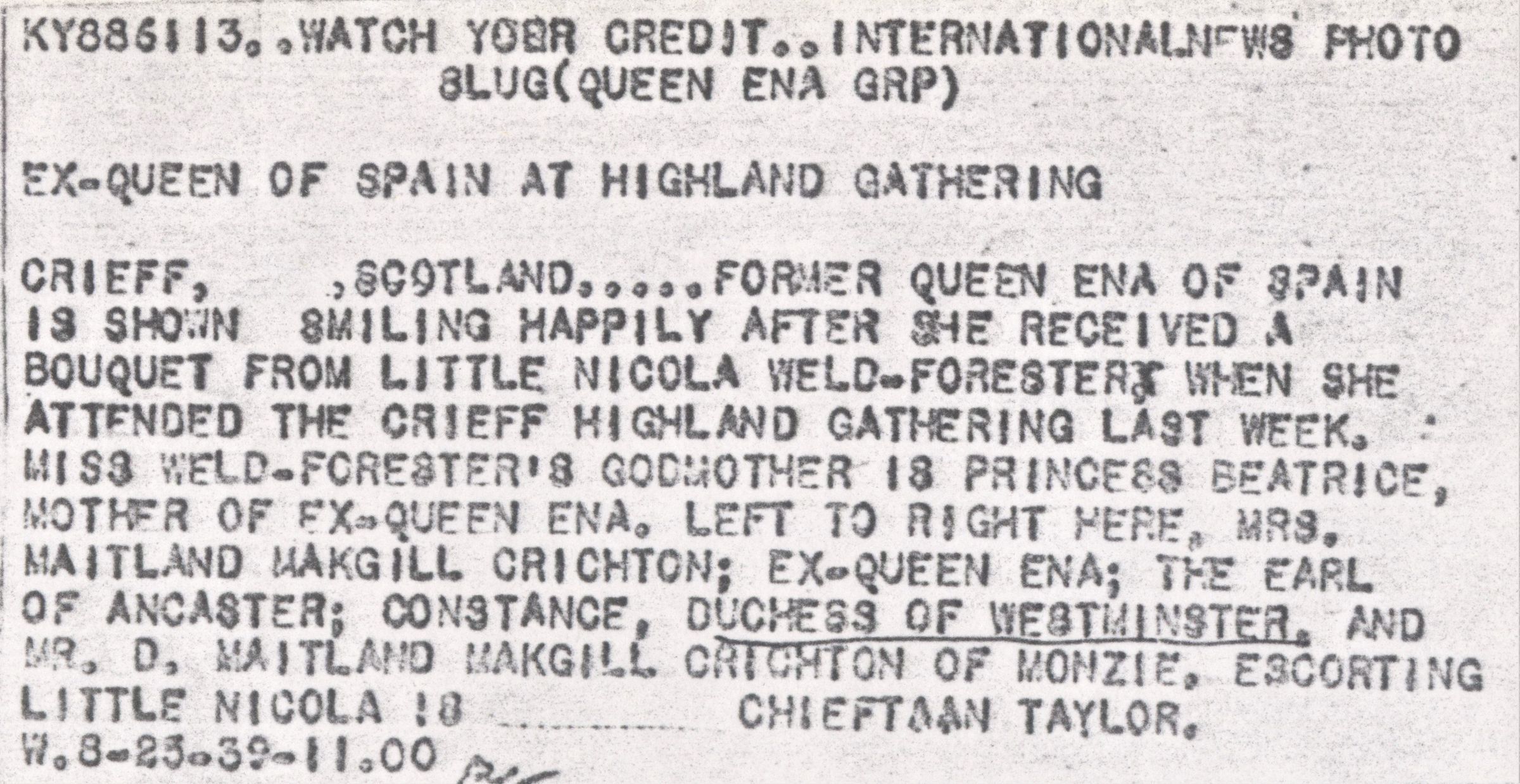 Crieff Scotland 1939; left to right; Mrs, Maitland Makgill Crichton: former queen of Spain Ena; the Earl of Ancaster; Constance, Duchess of Westminster in the striped suit with flower hat; Mr. D. Maitland Makgill Chrichton of Monzie ; scorting little Nicola 8; August 23, 1939Collection