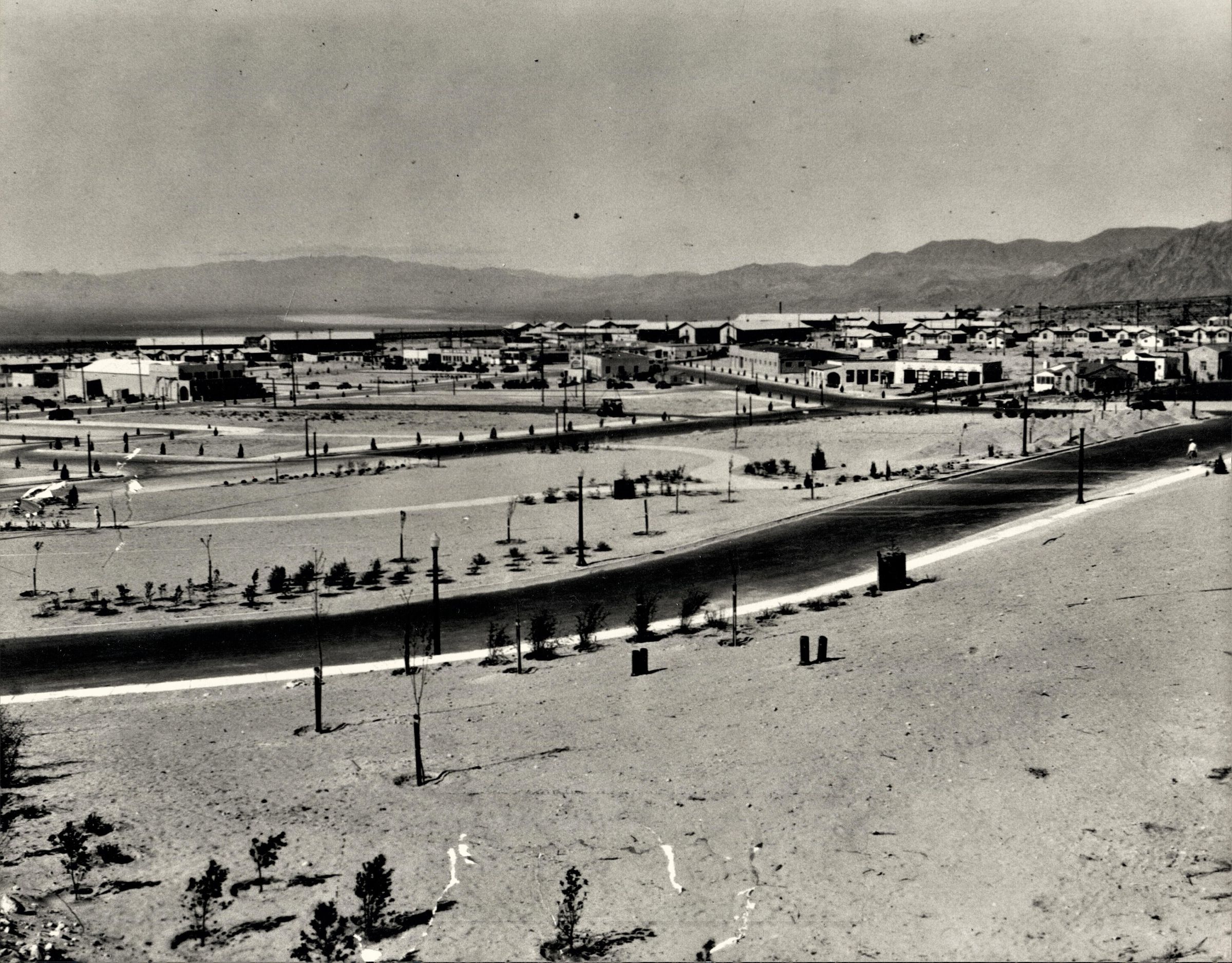 Panorama of Boulder City looking southwest from the Bureau of Reclamation Administration Building over Wilbur Square; Cardenas Plaza; site of the Boulder Dam Hotel, left of center, west of the Boulder Theater; May 2, 1932; USBR Photo, Wash. No. 1260; G.A. Beyer, photographerLexicon