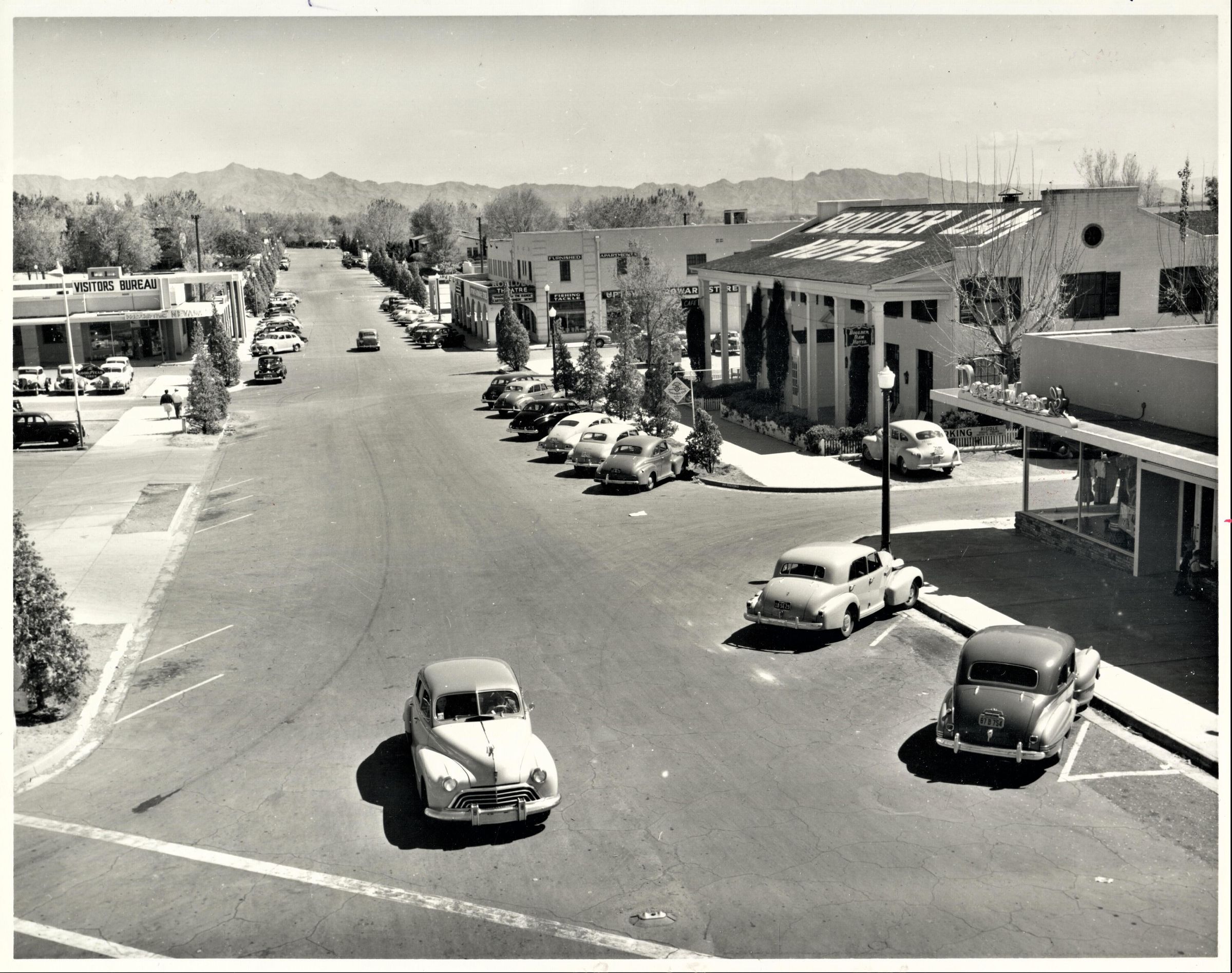 Arizona Street streetscape; aerial view of the Boulder Dam Hotel 1947; Bill Belknap photoCollection