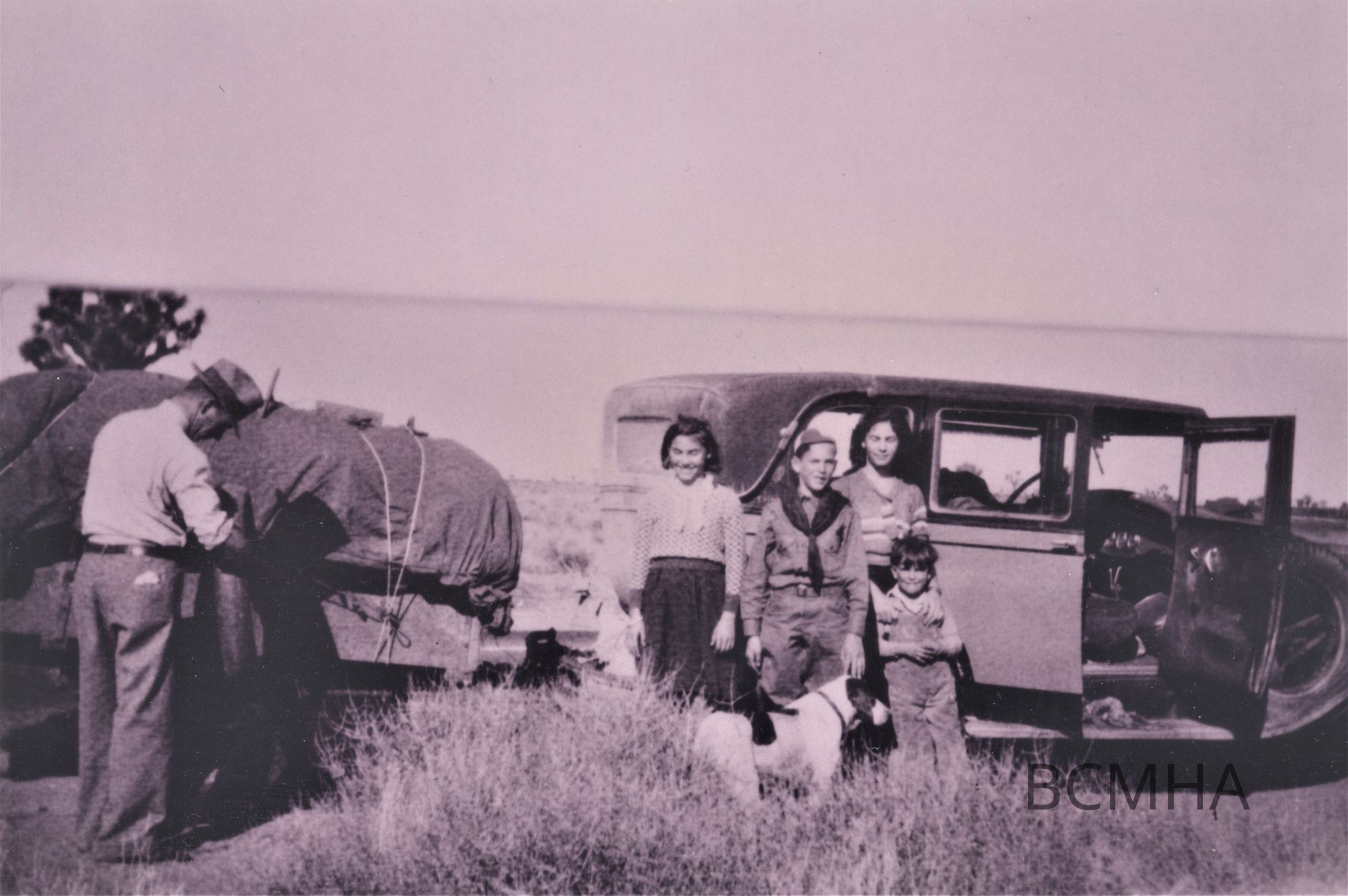 Friedman Family bound for Nevada, November 1931; l-r: Harold Friedman, Sr.; Dorothy Friedman; Harold Friedman, Jr.; (last name changed to Ragsdale); Elizabeth Friedman (Atkinson); Joe Friedman; Spot the dog, Eliza Friedman took the photo; Elizabeth Atkinson photoCollection