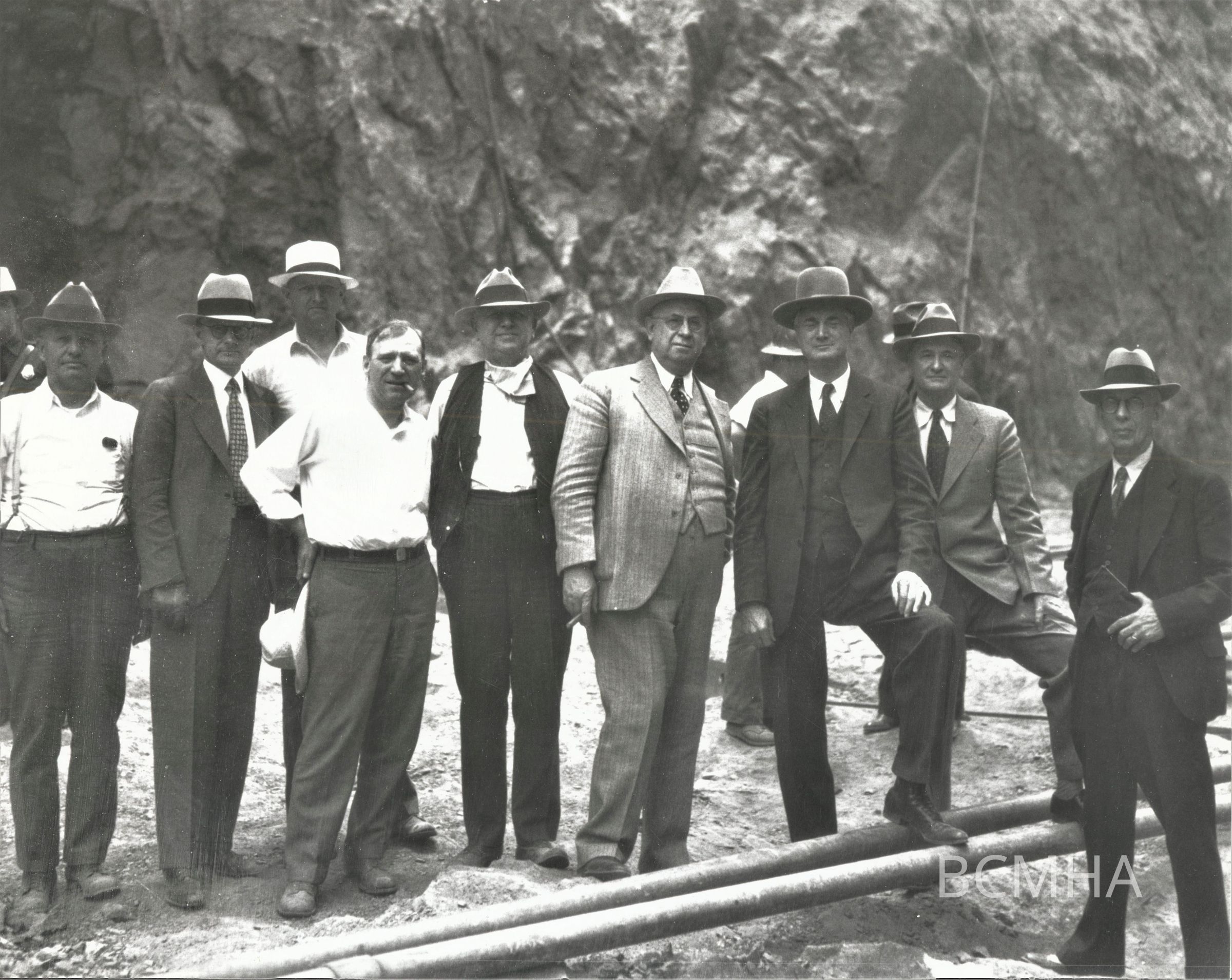 Left to right: H.J. Lawler, Director, Six Companies Inc.; Walker R. Young, Construction Engineer, USBR; Frank T. Crowe, General Superintendent, Six Companies Inc.; Charles Austin Shea, Director of Construction, Six Companies Inc.; Warren A. Bechtel, President, Six Companies Inc.; Raymond F. Walter, Chief Engineer, USBR; Theodore A. Walters, First Assistant Secretary of the Interior; Ed Clark; Charles P. "Pop" Squires, member of the original "Colorado River Commission," June 6, 1933; USBR photo (P45-301-1754); W.F West, photographerCollection