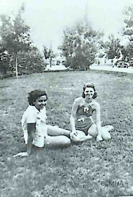 Boulder City fires and firefighting on the lawn at 409 Ave. B; the home of Boulder City fire chief Robert Hewes; c. 1935-1937; l-r: unidentified; Mary Ann Merrill; Mary Ann Merril photoLexicon