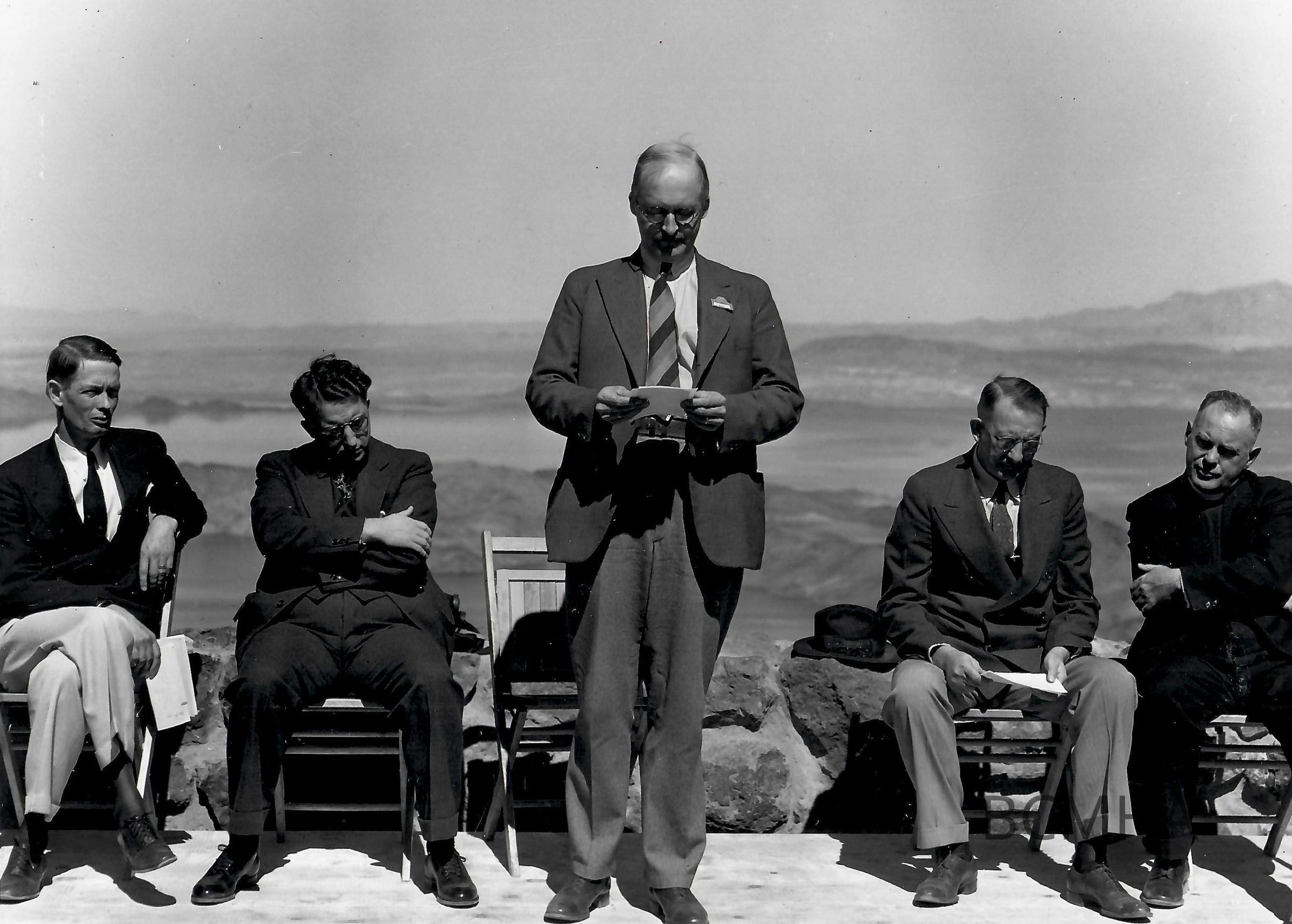 Hoover Dam art and monuments: Elwood Mead plaque unveiling, September 29, 1936; "Axel Ekwall (standing), Chief Engineer of the Royal Board of Waterfalls and Chairman of the Swedish Commission of the second International Commission of Large Dams, speaking on behalf of delegates of the Third World Power Conference at the unveiling of the plaque in memory of Dr. Elwood Mead."; seated extreme left, John C. Page, Boulder Canyon Project Office Engineer; USBR photo no. P45-301-3651; Paul Bond, photographerCollection