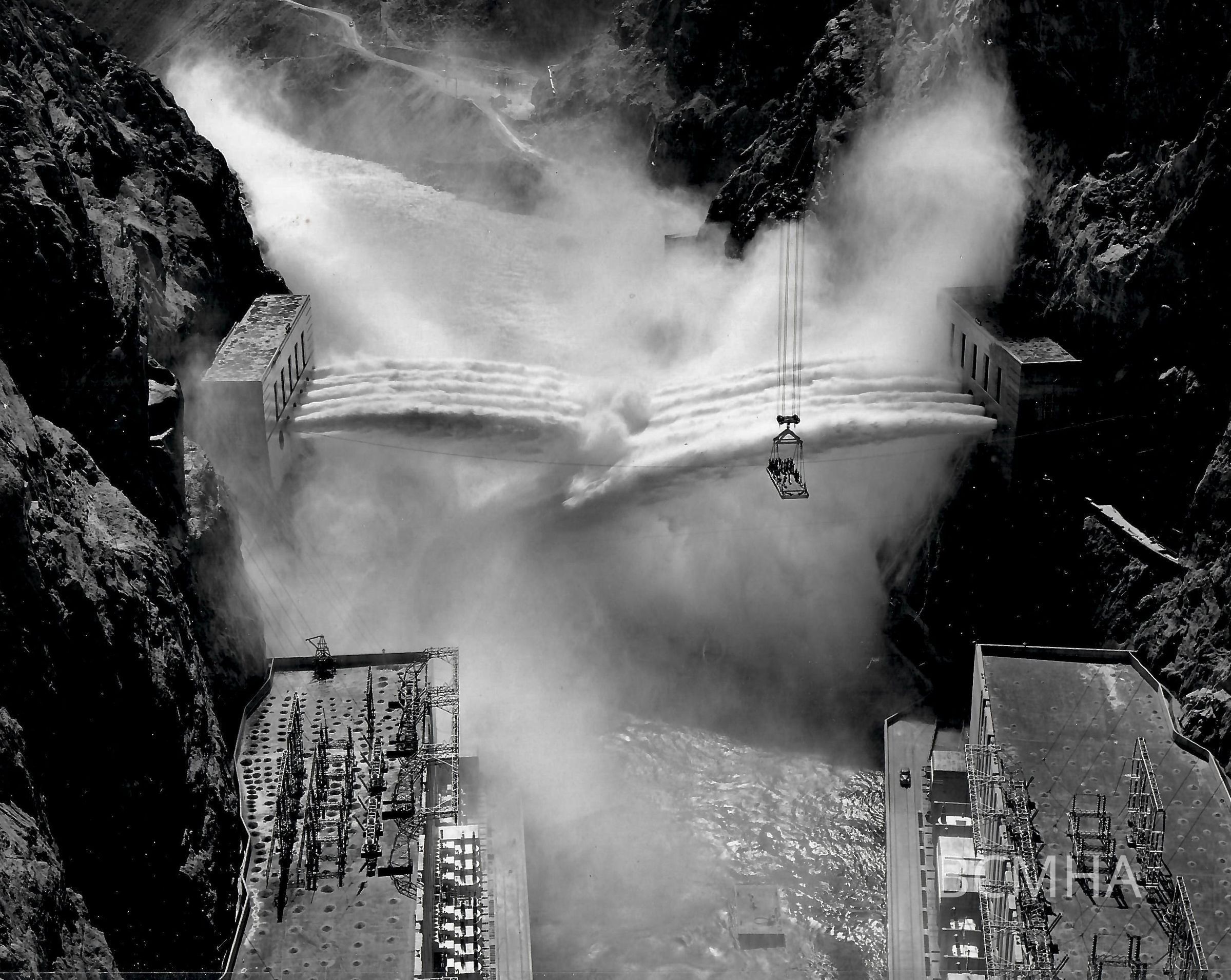 Hoover Dam canyon wall outlet works, September 28, 1940; "Looking downstream from the crest of Hoover Dam showing water flowing from the canyon wall outlet works needle valves. Radio, newspaper and newsreel men are being lowered on the skip by the government cableway for a close-up view."; USBR photo; Belknap Photographic ServicesCollection