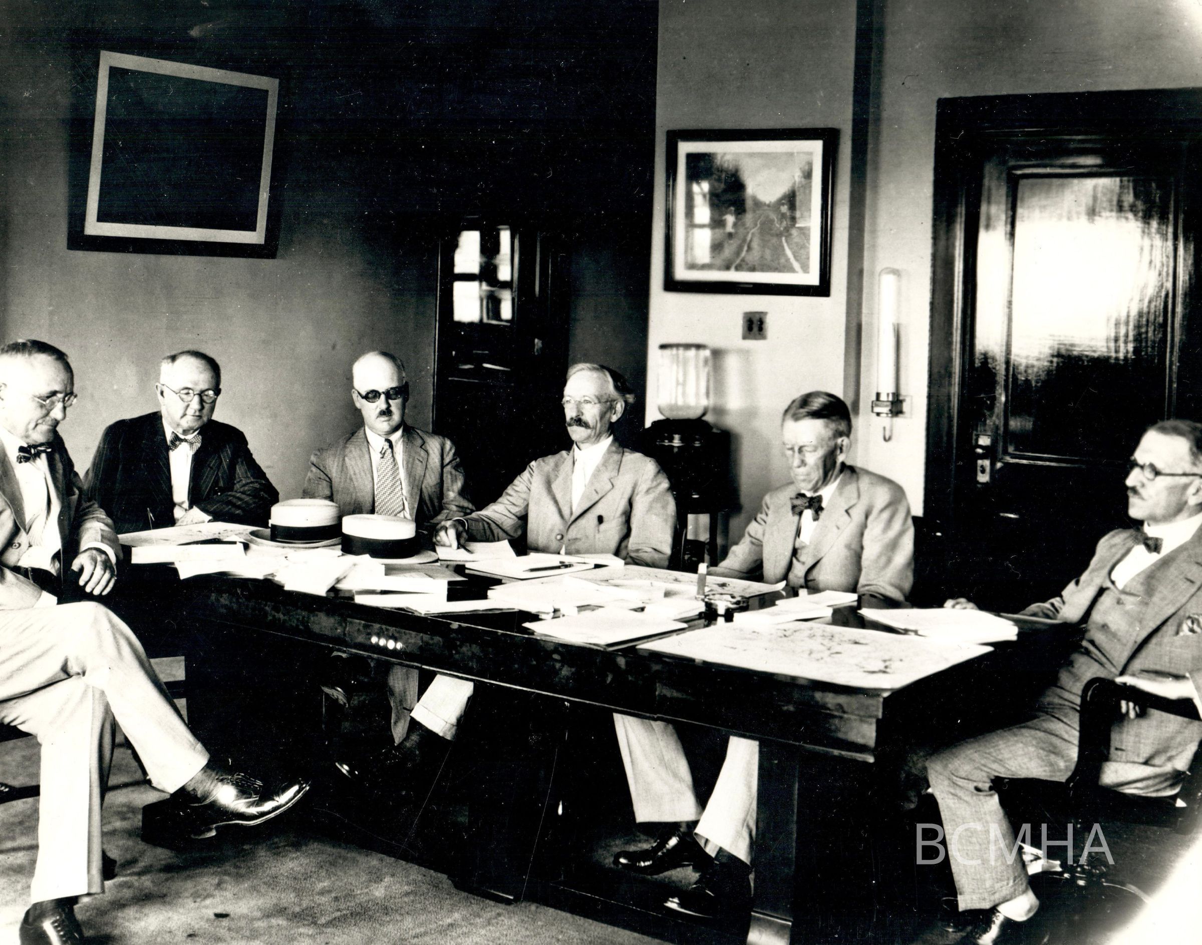 Hoover Dam Colorado River Board: "Meeting of Colorado River Board in the office of the Commissioner. Left to Right: Major-General William L. Sibert, Chairman; Dr. Elwood Mead, Commissioner of Reclamation; Warren J. Mead; Charles P. Berkey, Secretary of the Board; Daniel W. Mead; and Robert Ridgeway." 7-30-28; M. R. photograph; USBR photo/BCP 00292Collection