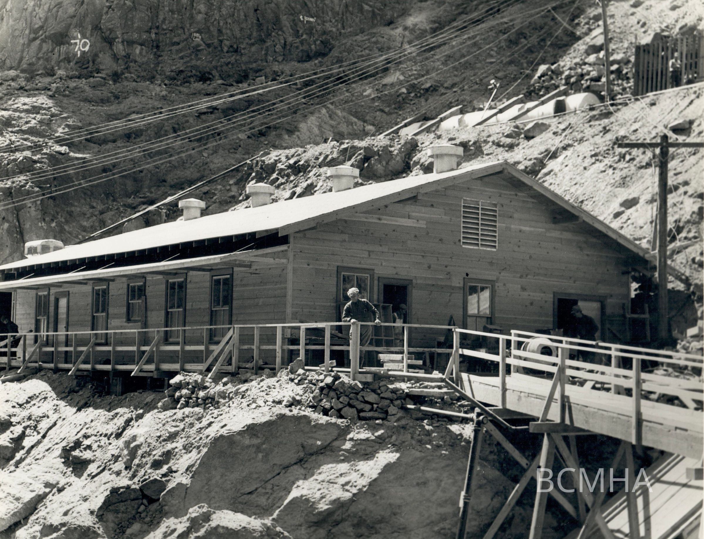 Hoover Dam: "Concrete testing laboratory erected by Bureau of Reclamation in Black Canyon. Bridge at right connects laboratory with Six Companies, Inc. low level concrete mixing plant. April 1, 1932."; Water and Power Resources Services photo by B. D. Glaha; USBR photo P45-301-1096 NACollection