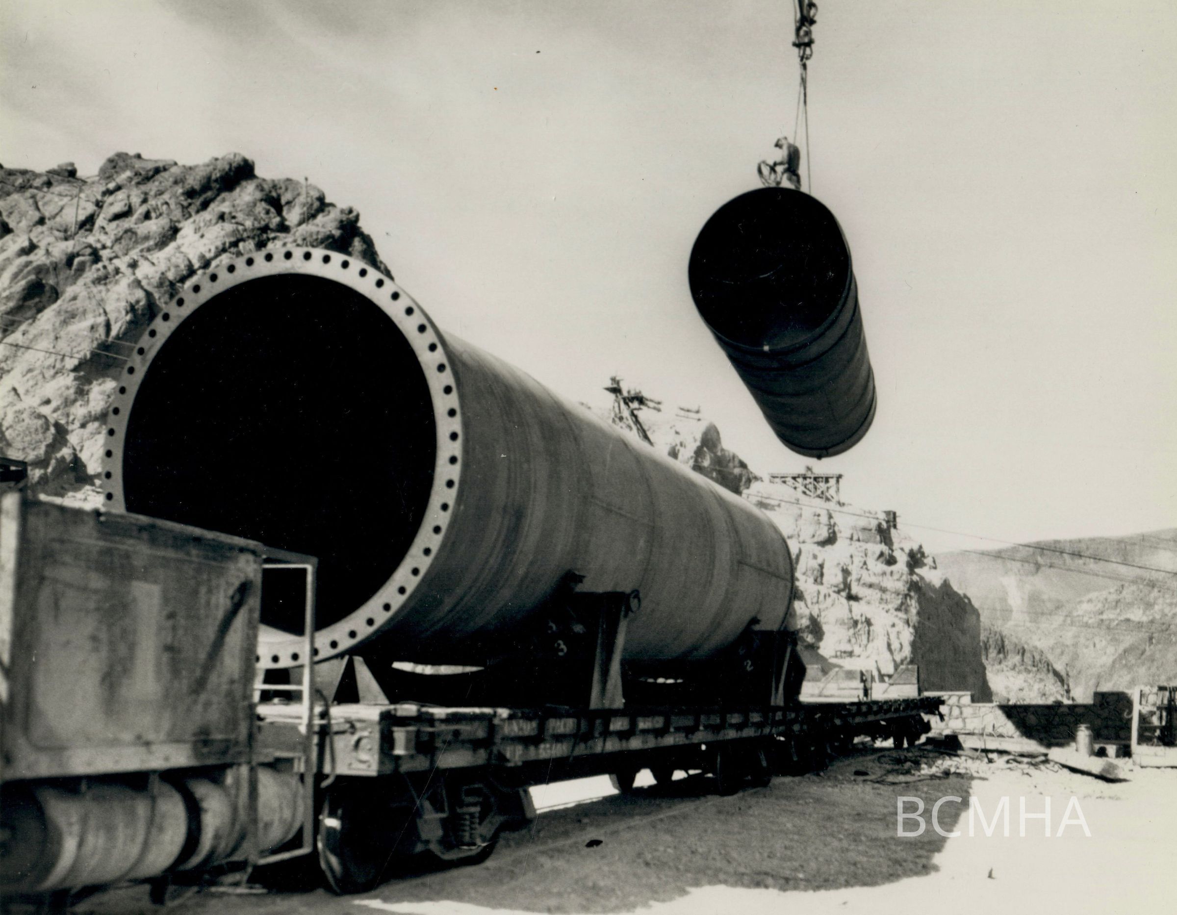 Hoover Dam - construction: "Unloading 8 1/2 ft. I. D. valve house outlet pipe with the Government cableway. View taken on the Nevada side looking upstream." 4-27-34; W. A. Bechtel Collection Photo #2643 - Volume Three; Roll 35 - Photo No. 6 Copy Negative - Bureau of ReclamationCollection