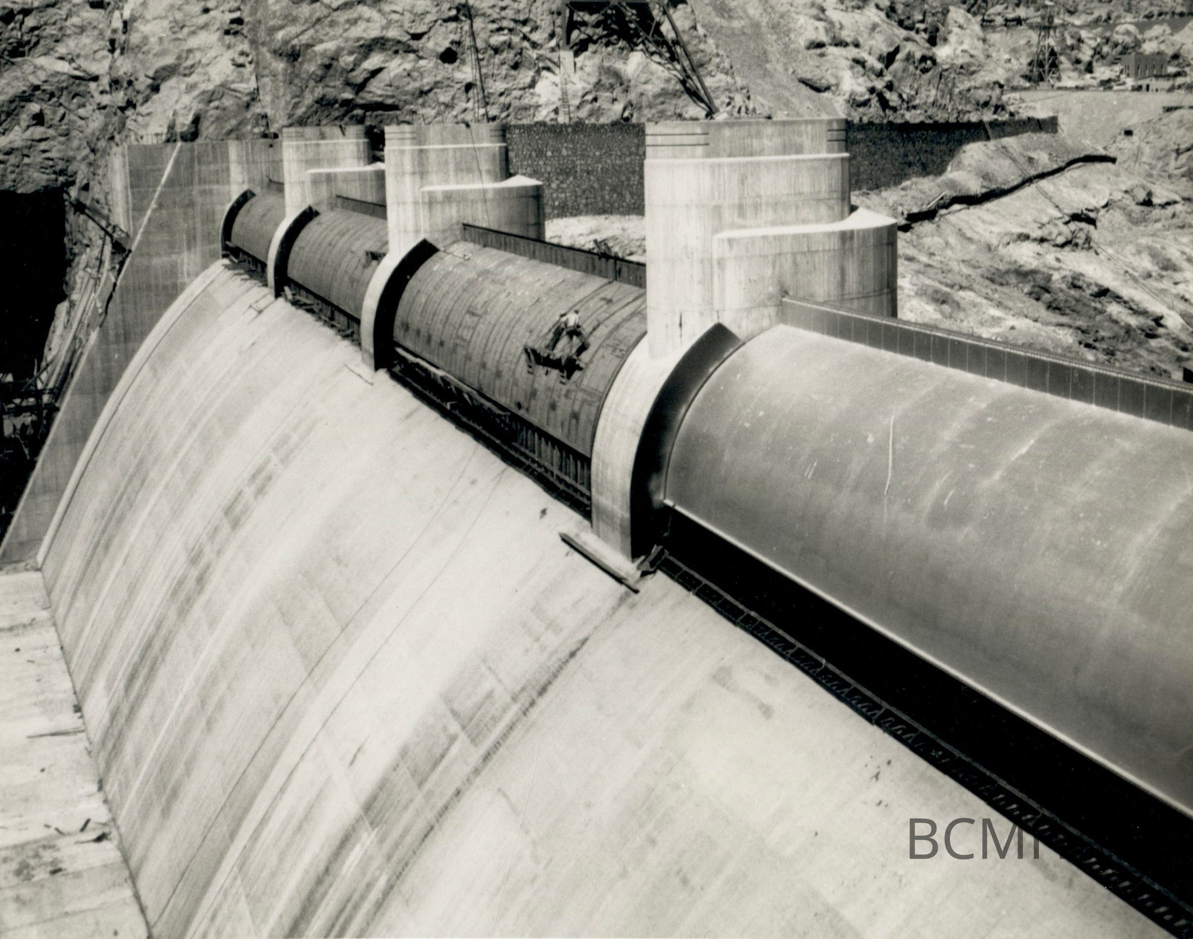 Hoover Dam construction: spillways, Arizona: "View of the drum gates in the Arizona spillway." 6-21-34; W. A. Bechtel Collection Photo #2741 - Volume Three; Roll 37 - Photo No. 7 Copy Negative - Bureau of ReclamationCollection