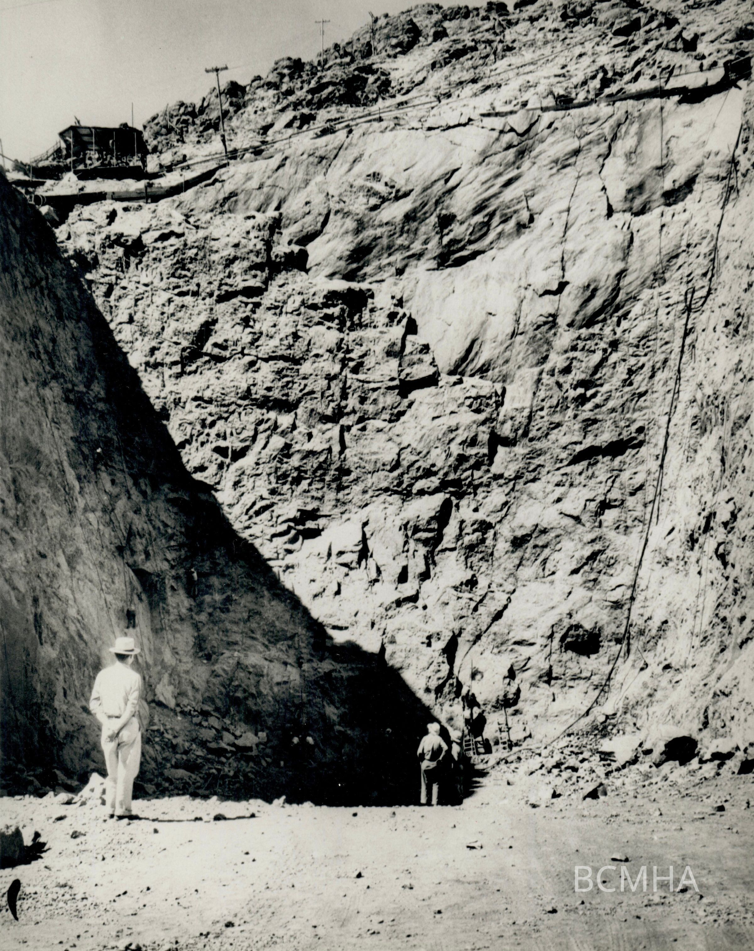 Hoover Dam construction: spillways, Nevada: "Close-up of the face of the Nevada spillway open cut excavation, just prior to the first shot going underground." 7-20-32; W. A. Bechtel Collection Photo #1360 - Volume Two; Roll 23 - Photo No. 2 Copy Negative - Bureau of ReclamationCollection