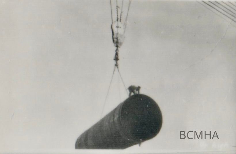 Hoover Dam construction: penstocks hauling a 13-foot section of conduit into Black Canyon, c. 1934; note the man riding the pipe down into the canyon; Altus "Tex" and Dorothy NunleyCollection