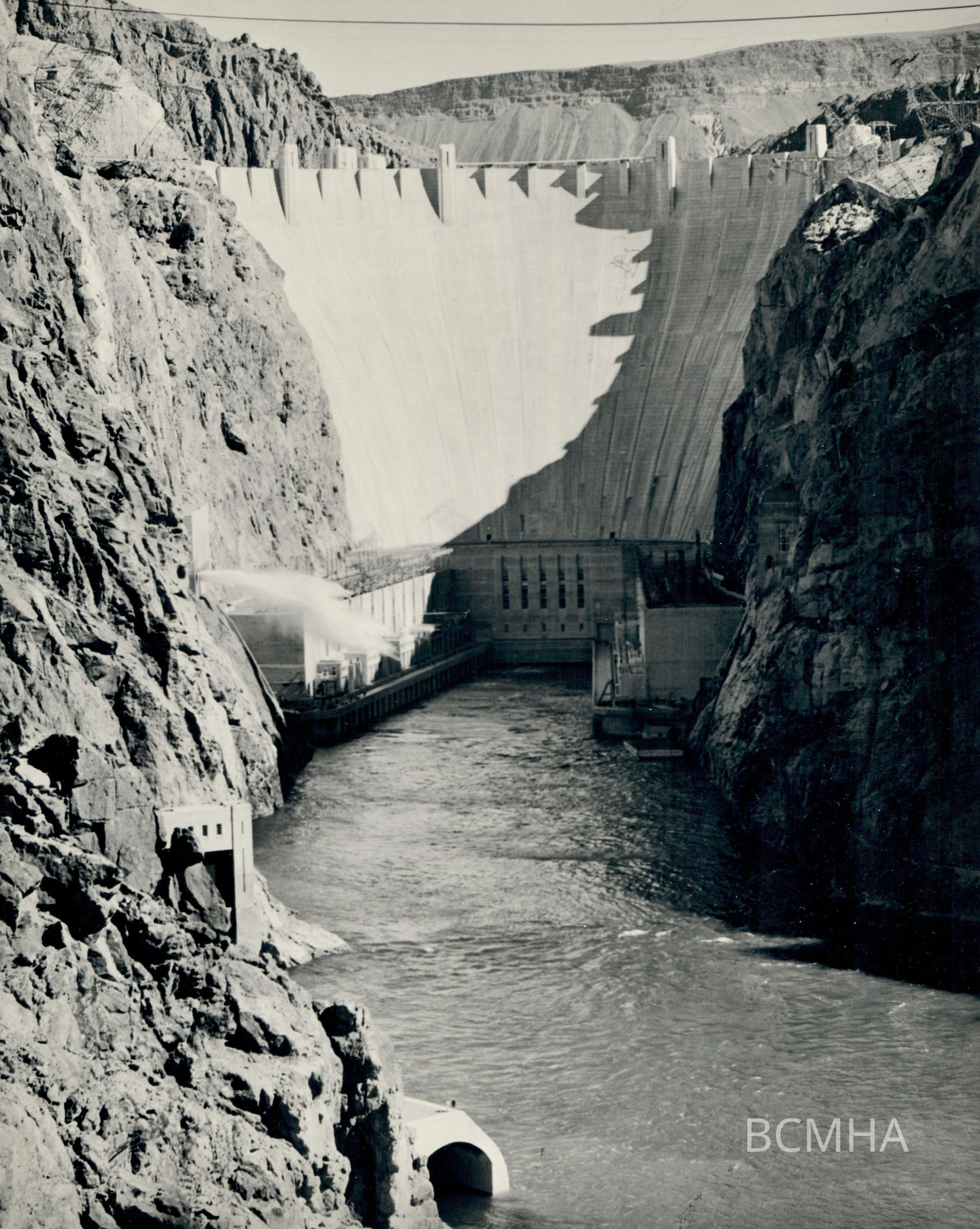 Hoover Dam construction: canyon wall outlet works in operation, c. 1936; USBR photo/BCP 6471Collection
