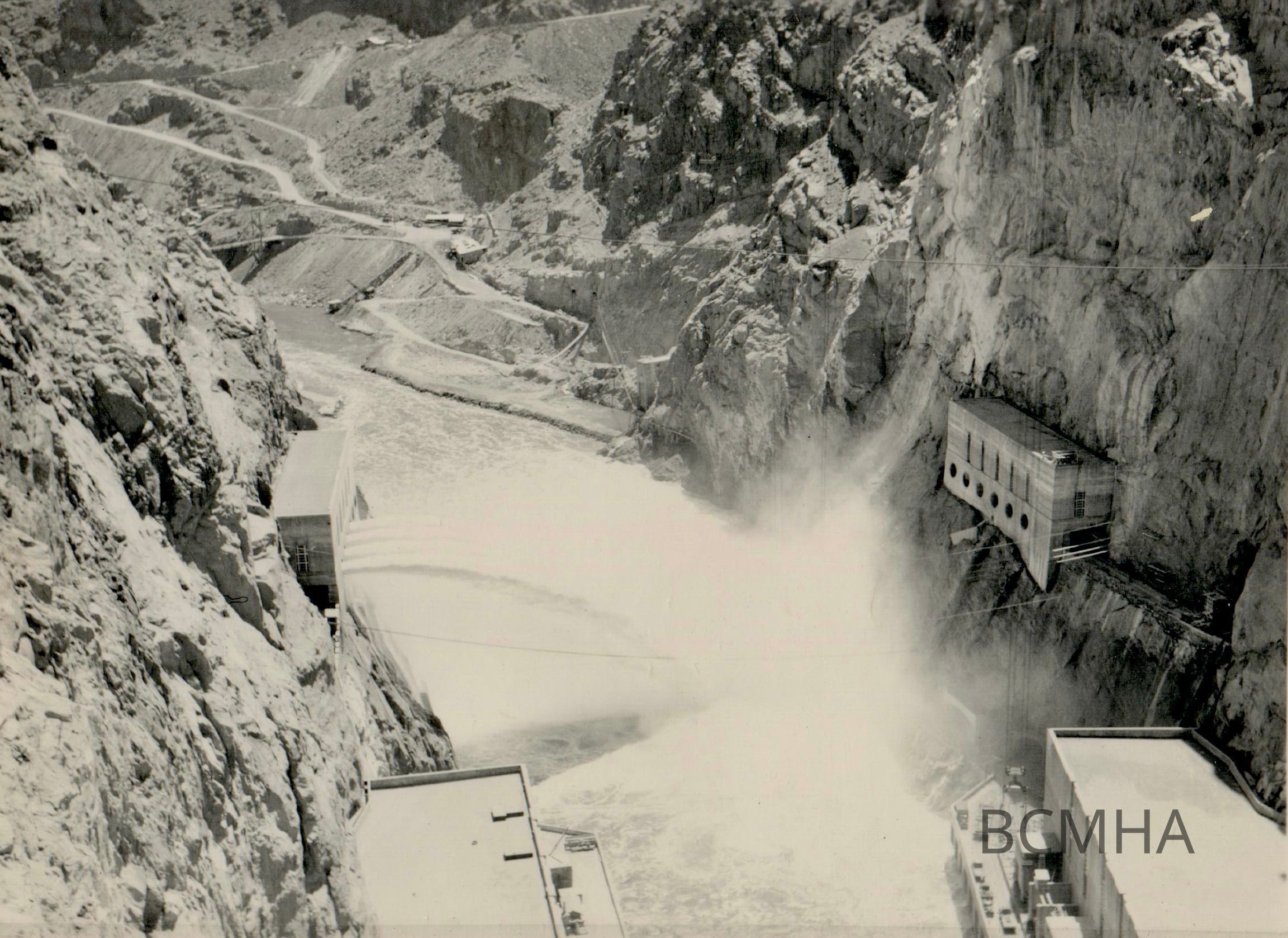 Hoover Dam construction: canyon wall outlet works in operation, c. 1936Collection