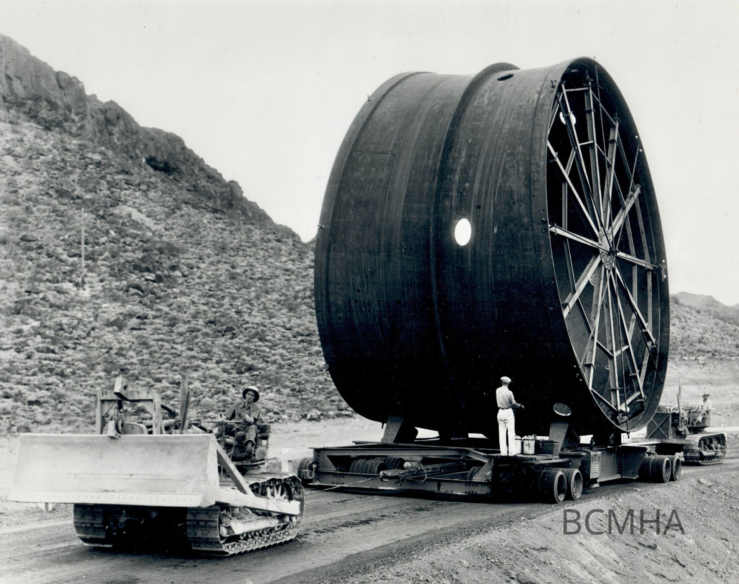 Hoover Dam construction: penstocks: "The first 30' diameter penstock pipe section is transported from the Babcock and Wilcox Company Plant to the dam on a La Crosse trailer powered by caterpillar tractors." 7-20-34; B. D. Glaha, photographer; USBR photo/BCP 02572Collection