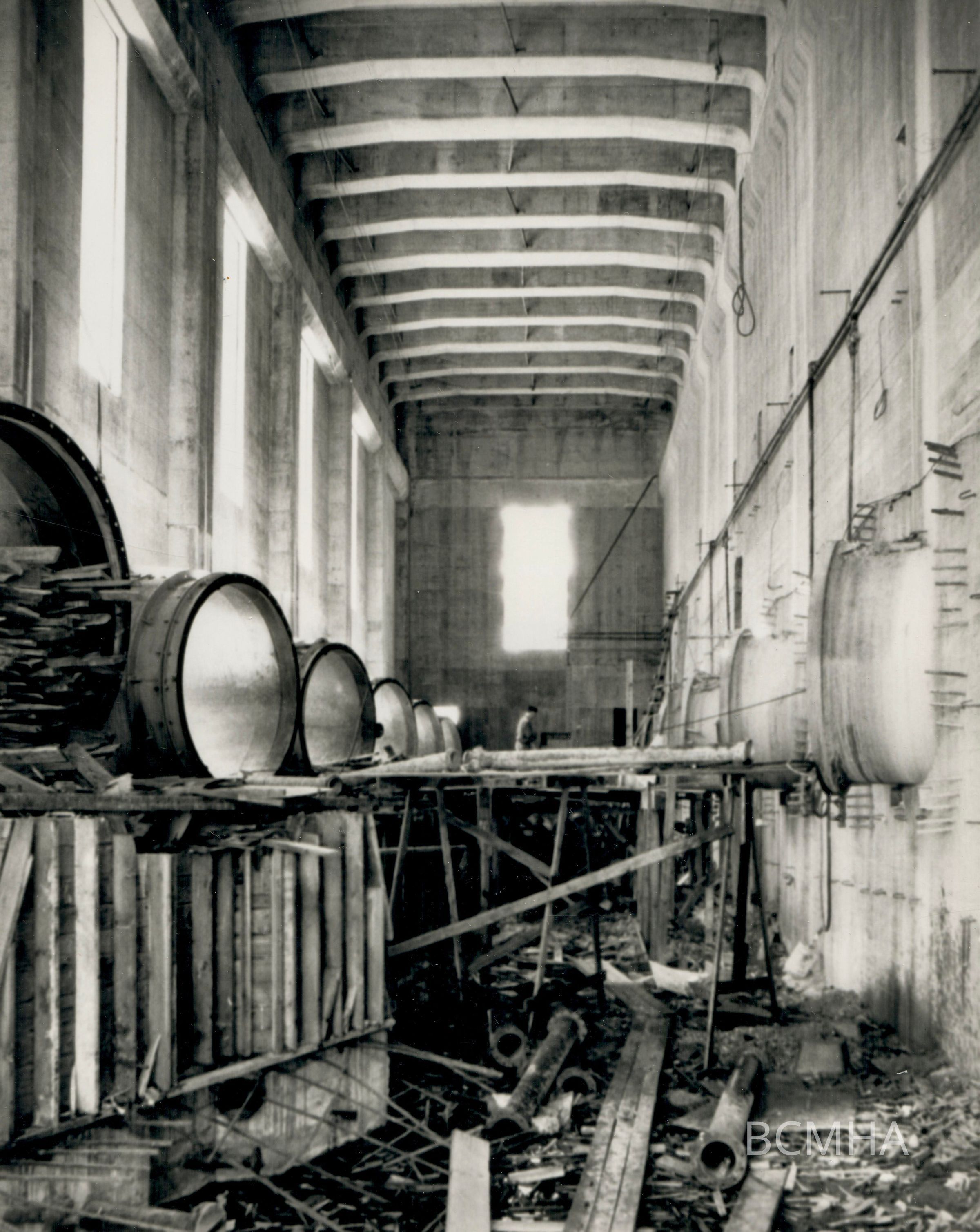 Hoover Dam construction: "Looking downstream in the Nevada valve house." 6-24-35; W. A. Bechtel Collection Photo #3335 - Volume Three: Roll 43 - Photo No. 6 Copy Negative - Bureau of ReclamationCollection